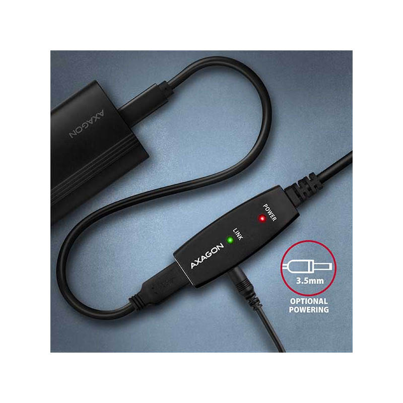 Celková délka USB trasy při kombinaci této 10m prodlužky s dalšími kabely systému aktivní USB kabeláže AXAGON až 50 metrů.