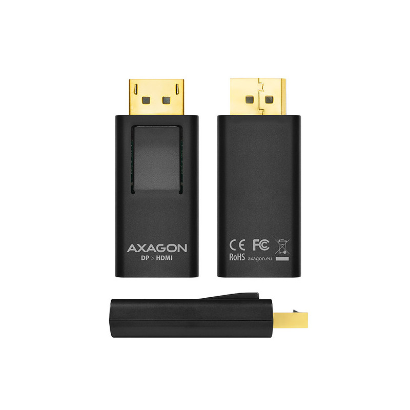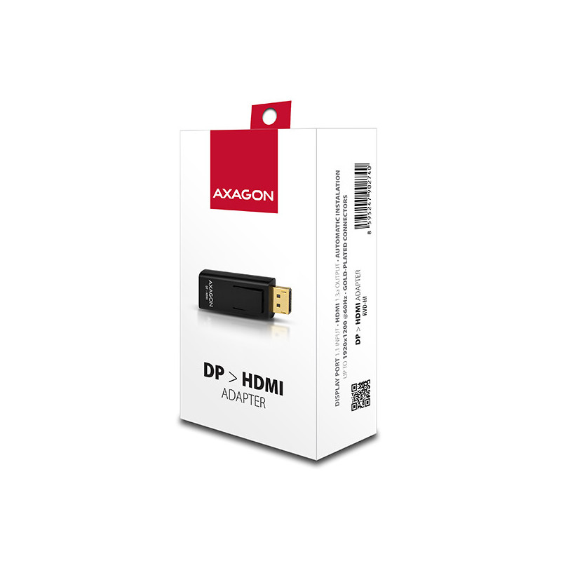 DisplayPort -> HDMI aktivní adapter AXAGON RVD-HI pro připojení HDMI monitoru/TV/projektoru k počítači s výstupem DiplayPort.