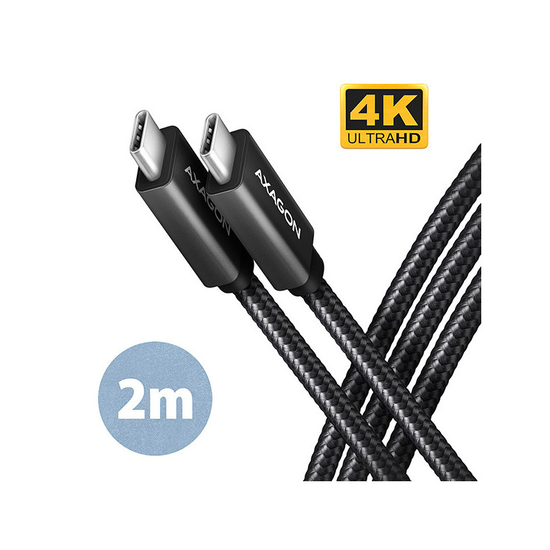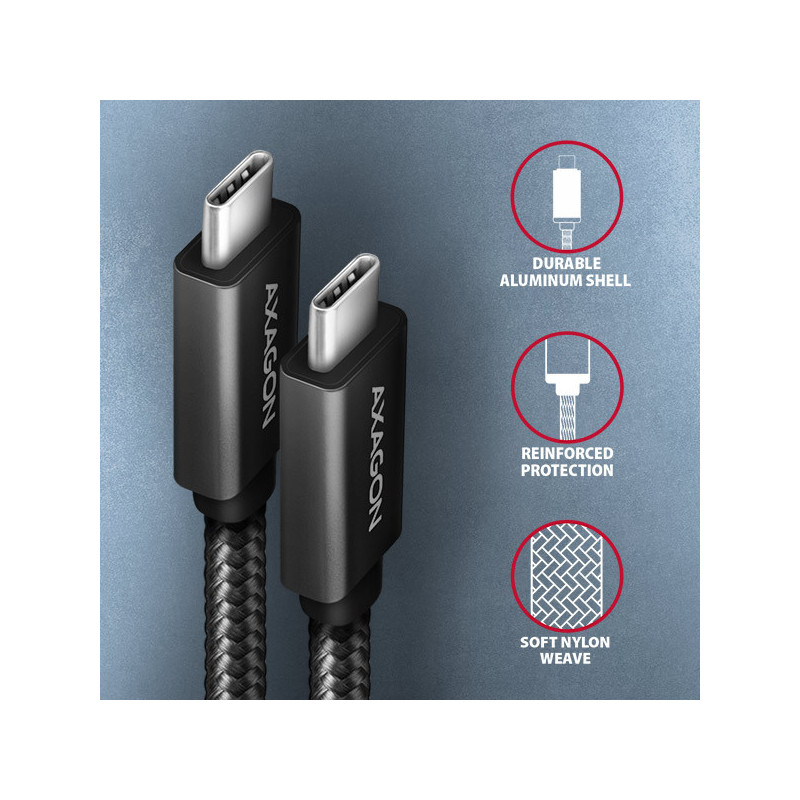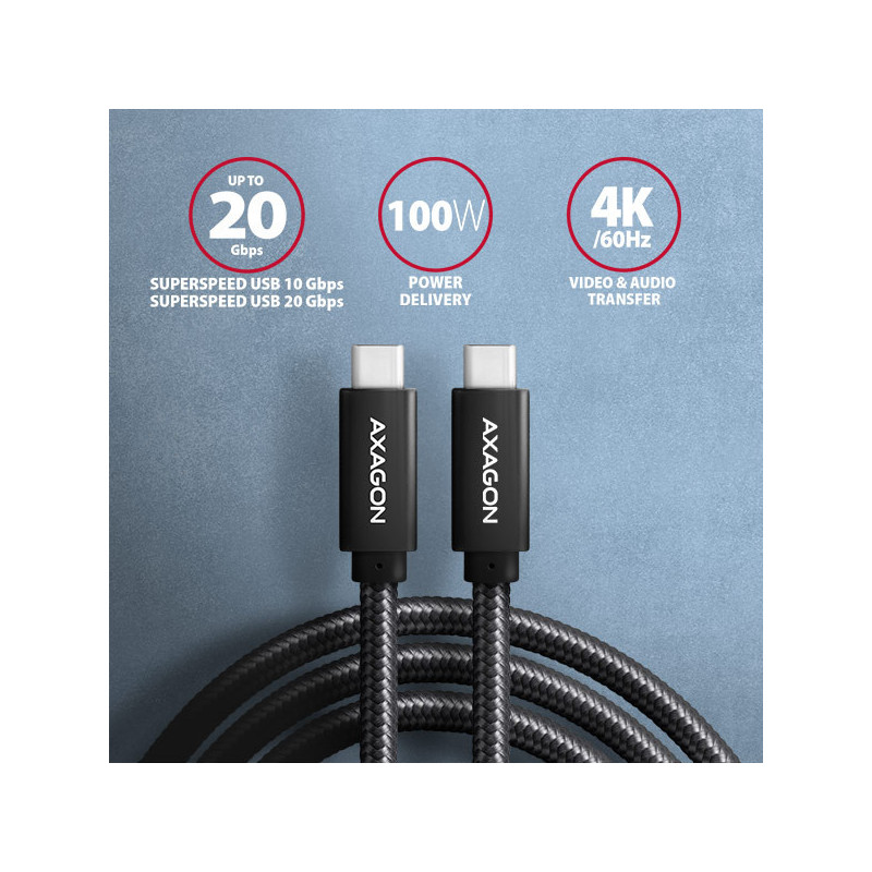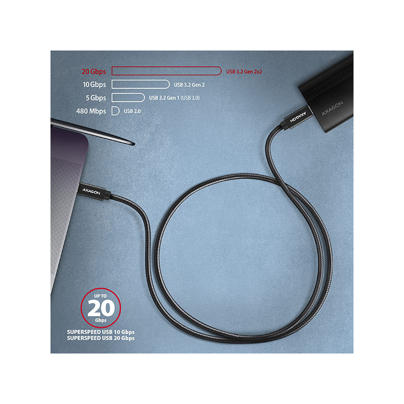 Prémiový propojovací USB-C <-> USB-C datový a nabíjecí AXAGON BUCM32-CM20AB SPEED+ USB 3.2 Gen 2 kabel s konektory USB-C male na obou koncích. Kabel je navržen pro velmi rychlé datové přenosy a nabíjení notebooků, telefonů, tabletů a dalších mobilních zařízení. Podporuje přenos dat rychlostí až 20 Gb/s a nabíjení proudem až 5A. Kabel také umožní přenos obrazu až do rozlišení 4K/60Hz Ultra HD a zvuku.