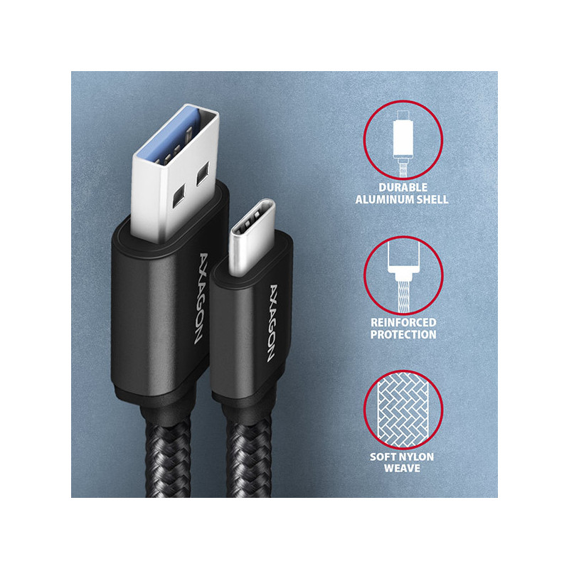 Prémiový propojovací USB-C <-> USB-A datový a nabíjecí AXAGON BUCM3-AM15AB SPEED USB 3.2 Gen 1 kabel s konektory USB-C male a USB-A male. Kabel je navržen pro rychlé datové přenosy a nabíjení notebooků, telefonů, tabletů a dalších mobilních zařízení. Podporuje přenos dat rychlostí až 5 Gb/s a nabíjení proudem až 3A.