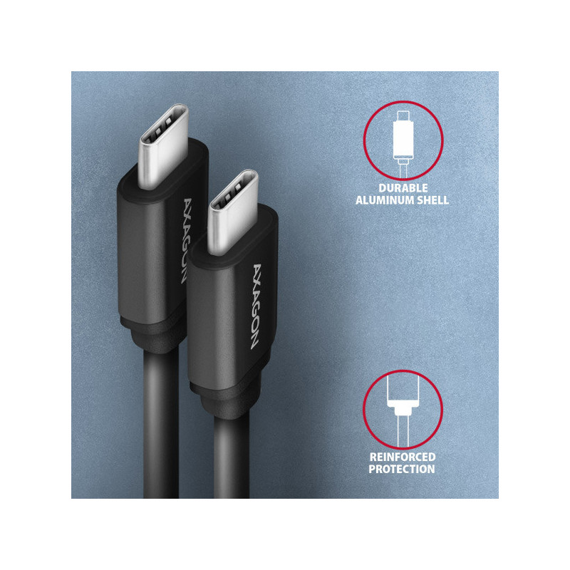 Napájecí vodiče 22AWG (nižší číslo = větší průřez a nižší odpor vodiče) garantují rychlé nabíjení telefonů a dalších mobilních zařízení. Kabel podporuje také nabíjení notebooků technologií Power Delivery 60W. Datové vodiče 30AWG spolu s kvalitním stíněním, zajišťují spolehlivý přenos dat. Dvojité stínění chrání přenášené signály před nepříznivým rušením.