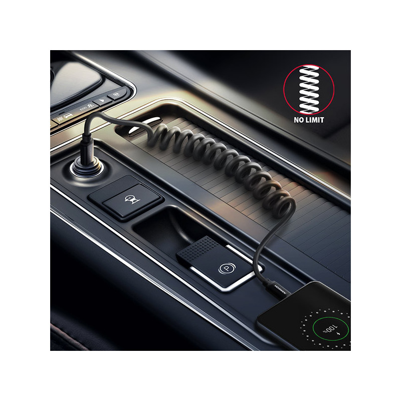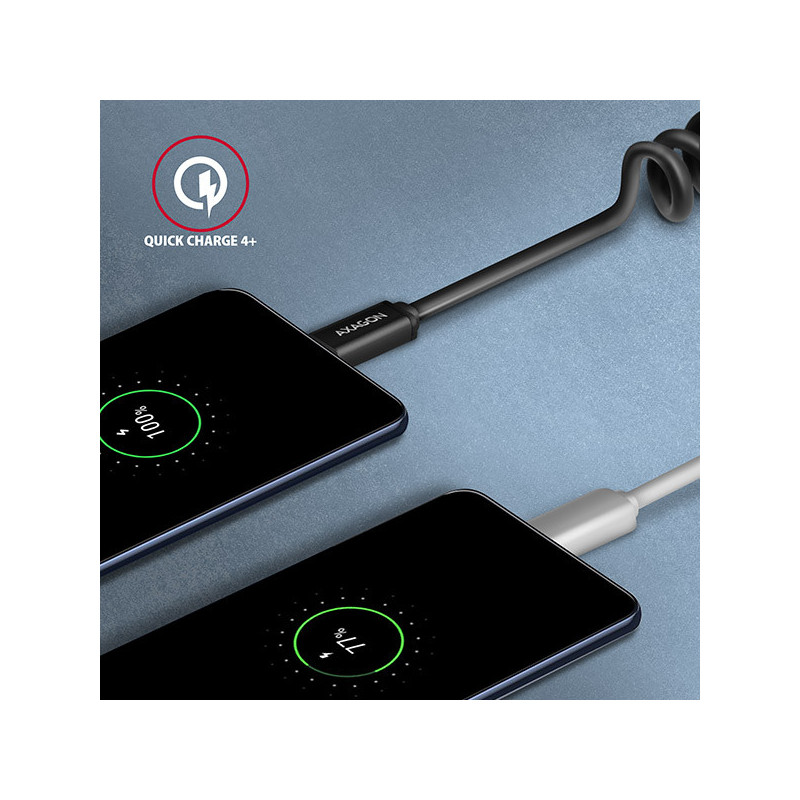 Odolný datový a napájecí kabel s prodlouženou životností je opatřen kovovými koncovkami, konektory s poniklovaným povrchem a pozlacenými kontakty. Vodiče kabelu jsou vyrobené z pocínované bezkyslíkaté mědi. Kvalitní izolace kabelu, vyrobená z flexibilního TPE, zaručuje maximální odolnost, ale zachovává i dostatečnou ohebnost. Díky kroucenému a natahovacímu provedení kabel zabírá minimum místa a je tak ideálním doplňkem do auta. Ve zkráceném stavu je kabel dlouhý jen 35 cm a nikde nepřekáží. V nataženém stavu pohodlně dosáhne 60 cm daleko od zásuvky.