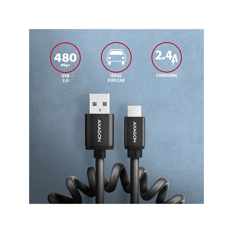 Odolný datový a napájecí kabel s prodlouženou životností je opatřen kovovými koncovkami, konektory s poniklovaným povrchem a pozlacenými kontakty. Vodiče kabelu jsou vyrobené z pocínované bezkyslíkaté mědi. Kvalitní izolace kabelu, vyrobená z flexibilního TPE, zaručuje maximální odolnost, ale zachovává i dostatečnou ohebnost. Díky kroucenému a natahovacímu provedení kabel zabírá minimum místa a je tak ideálním doplňkem do auta. Ve zkráceném stavu je kabel dlouhý jen 35 cm a nikde nepřekáží. V nataženém stavu pohodlně dosáhne 60 cm daleko od zásuvky.