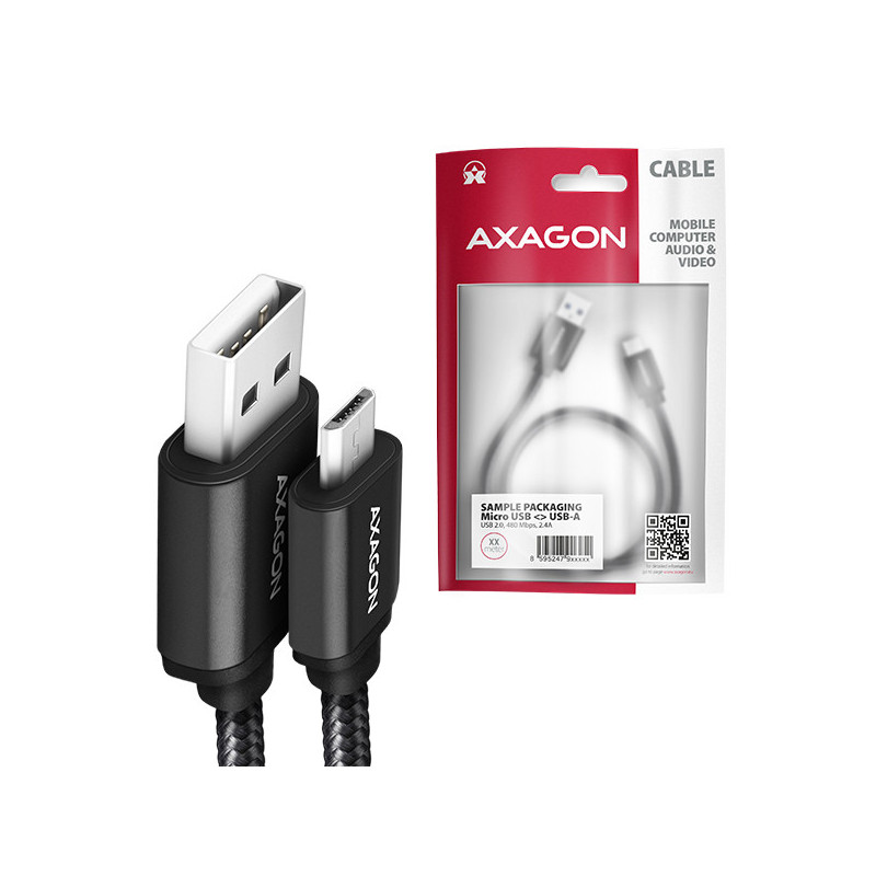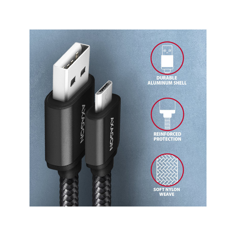 Prémiový propojovací Micro USB <-> USB-A datový a nabíjecí AXAGON BUMM-AM15AB HQ USB 2.0 kabel s konektory Micro USB male a USB-A male. Kabel je navržen pro synchronizaci dat a nabíjení telefonů, tabletů a dalších mobilních zařízení. Podporuje přenos dat rychlostí až 480 Mb/s a nabíjení proudem až 2.4A.