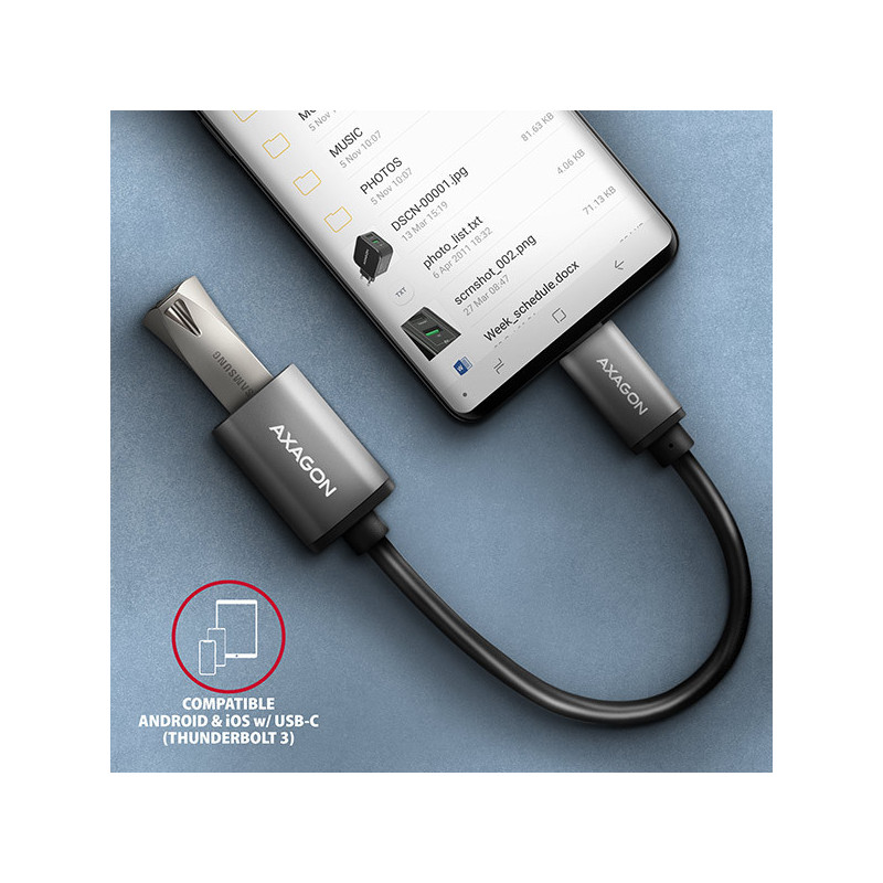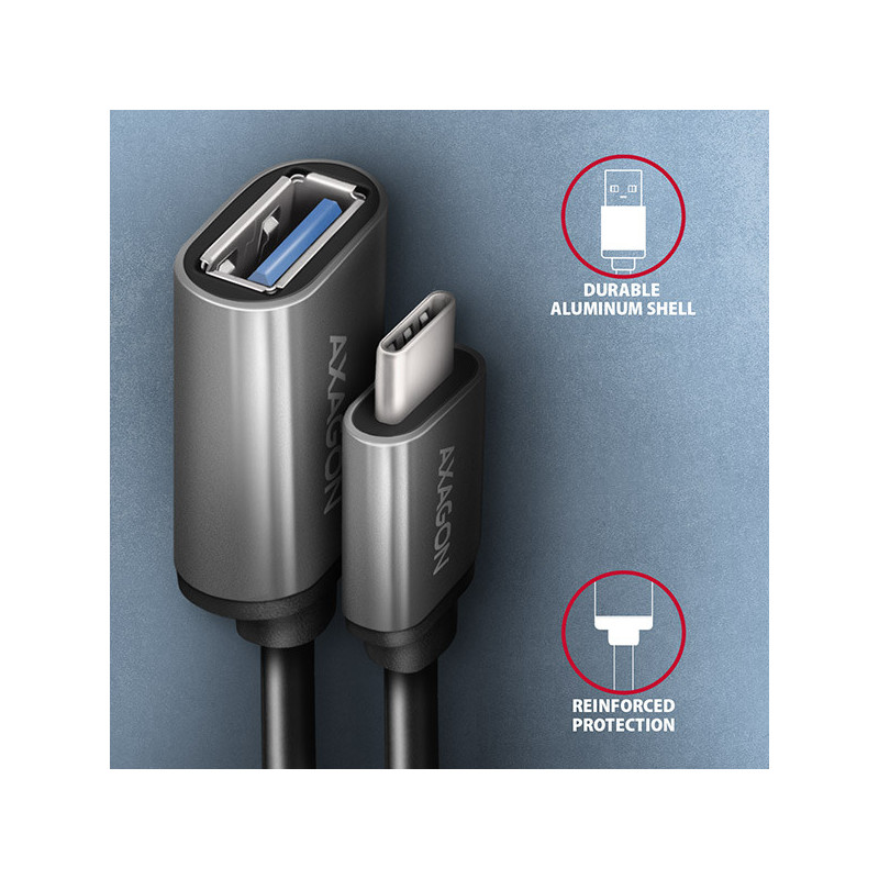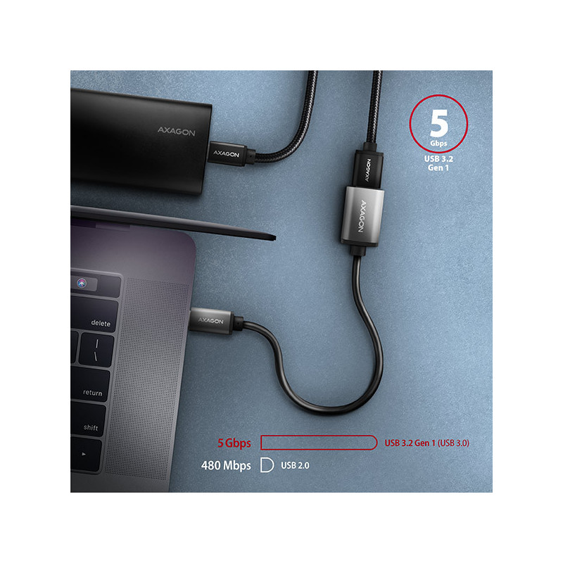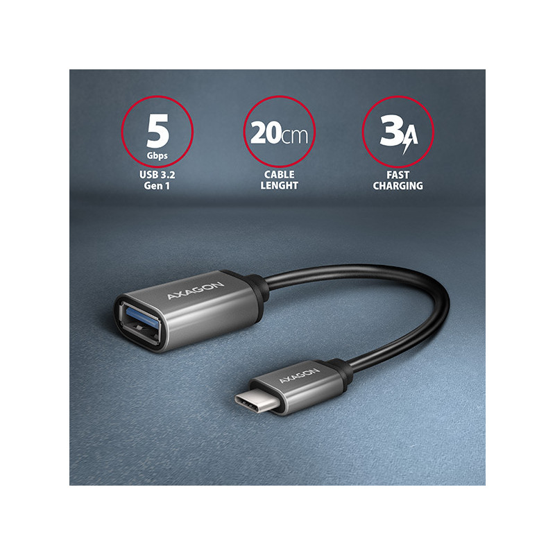 Kabelová redukce USB-C <-> USB-A AXAGON RUCM-AFAC připojí stávající zařízení s USB-A konektorem k novému zařízení s moderním USB-C rozhraním. Redukce je navržena pro rychlé připojení USB hubu nebo externího disku k notebookům vybaveným pouze USB-C konektory. Výborně poslouží také pro připojení flash disku k mobilnímu telefonu s USB-C konektorem. Podporuje přenos dat rychlostí až 5 Gb/s a napájení proudem až 3A.