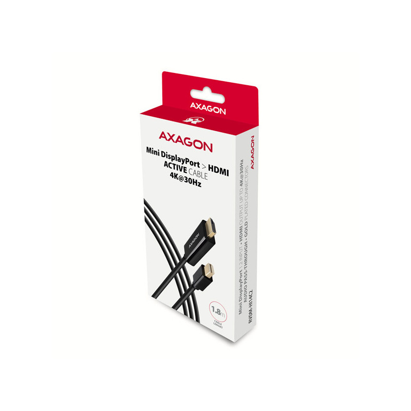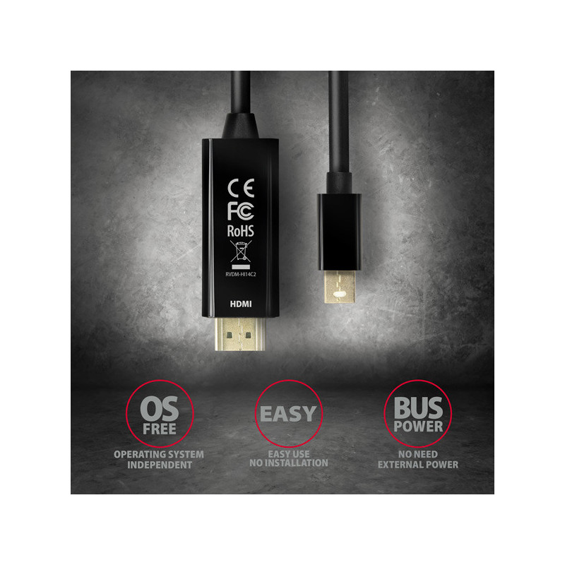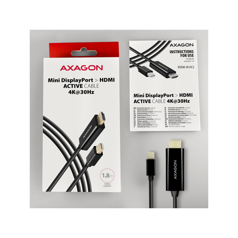 Mini DisplayPort -> HDMI aktivní kabel - redukce AXAGON RVDM-HI14C2 pro připojení HDMI monitoru/TV/projektoru k počítači s výstupem Mini DisplayPort.