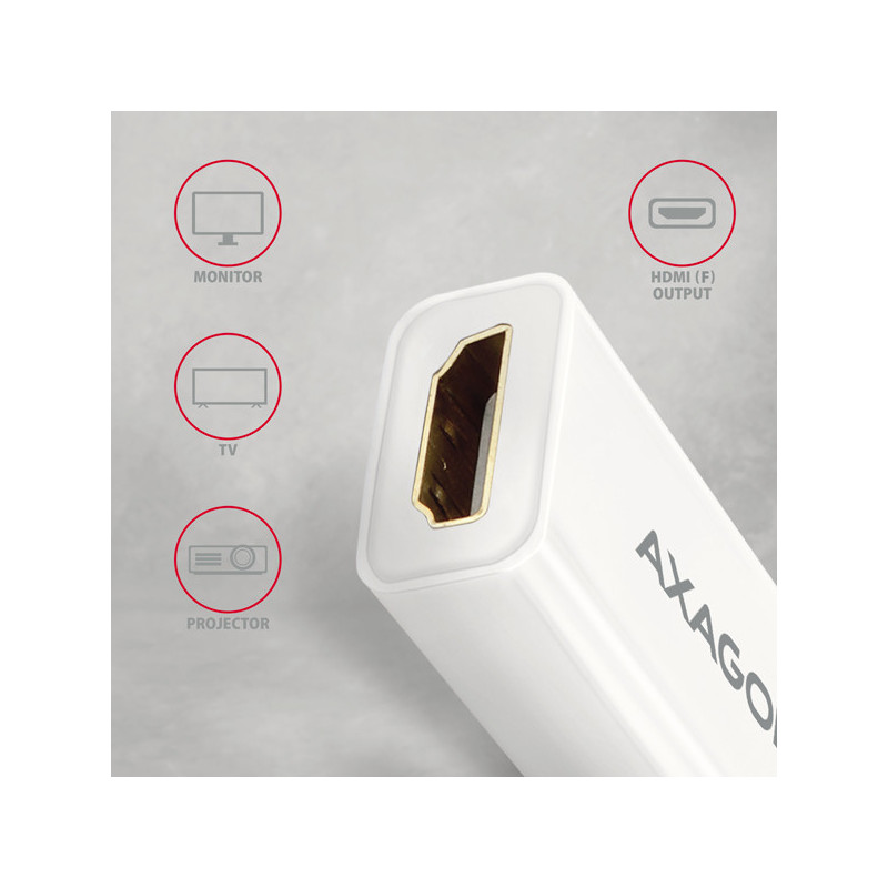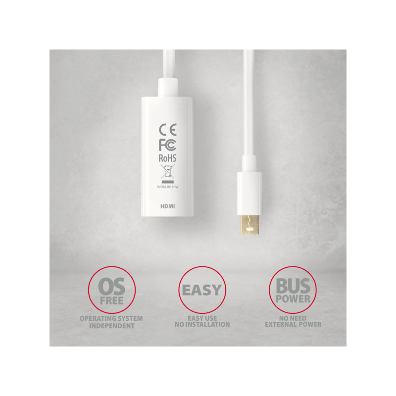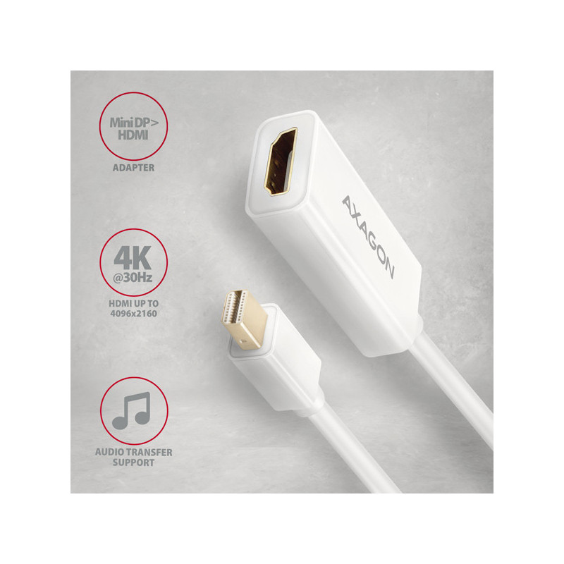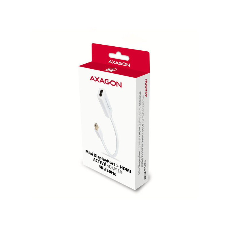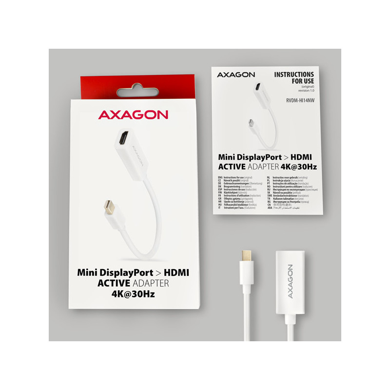 Mini DisplayPort -> HDMI aktivní adaptér AXAGON RVDM-HI14NW pro připojení HDMI monitoru/TV/projektoru k počítači s výstupem Mini DisplayPort.