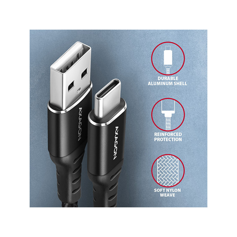 Prémiový propojovací USB-C <-> USB-A datový a nabíjecí AXAGON BUCM-AM20AB HQ USB 2.0 kabel s konektory USB-C male a USB-A male. Kabel je navržen pro synchronizaci dat a nabíjení telefonů, tabletů a dalších mobilních zařízení. Podporuje přenos dat rychlostí až 480 Mb/s a nabíjení proudem až 3A. Kabel je kompatibilní s nabíjecími technologiemi Quick Charge, Samsung AFC, Huawei FCP, SMART a dalšími.