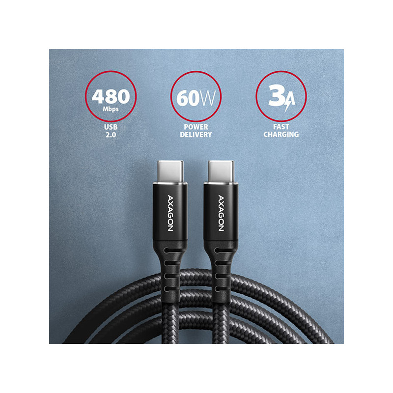 Prémiový propojovací USB-C <-> USB-C datový a nabíjecí AXAGON BUCM-CM10AB HQ USB 2.0 kabel s konektory USB-C male na obou koncích. Kabel je navržen pro synchronizaci dat a nabíjení notebooků, telefonů, tabletů a dalších mobilních zařízení. Podporuje přenos dat rychlostí až 480 Mb/s a nabíjení proudem až 3A. Kabel je kompatibilní s nabíjecími technologiemi Power Delivery 60W, Quick Charge, Samsung AFC, Huawei FCP, SMART a dalšími.