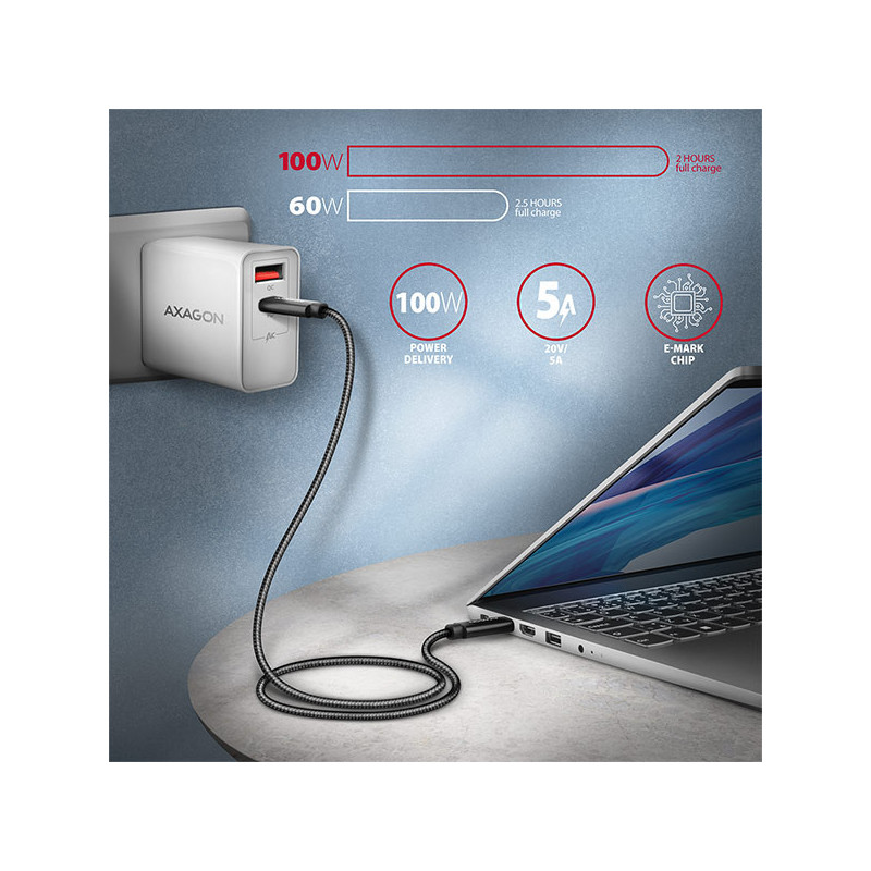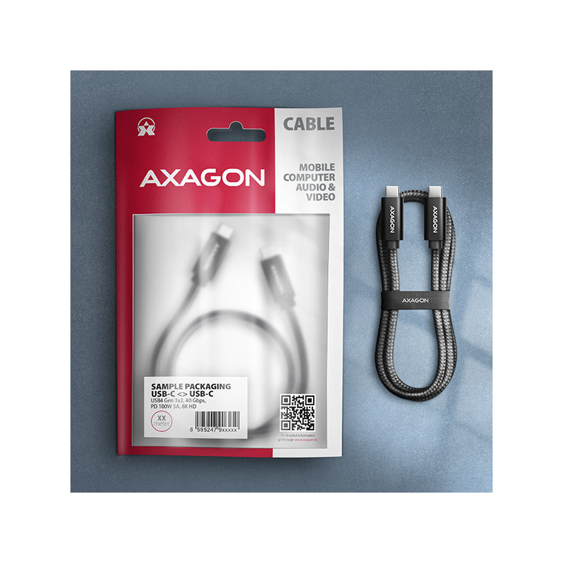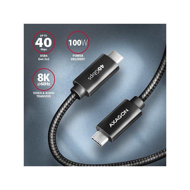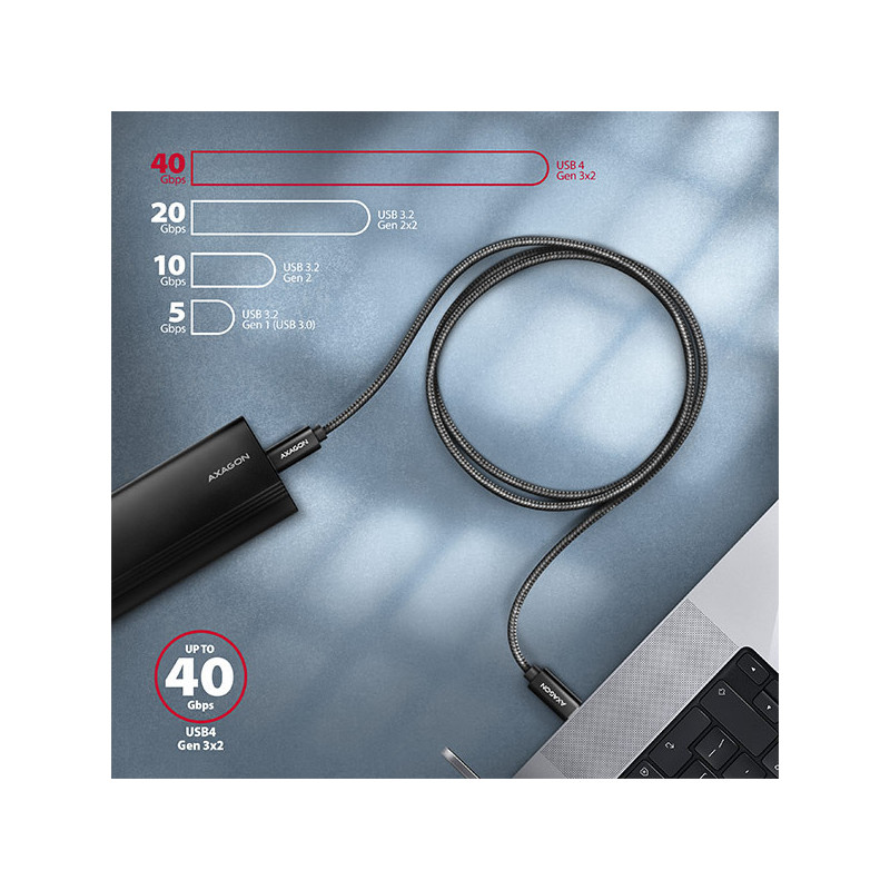 Prémiový propojovací USB-C <-> USB-C datový a nabíjecí AXAGON BUCM432-CM10AB NewGEN+ kabel s konektory USB-C male na obou koncích. Kabel má plnohodnotné (Full-featured) zapojení podle specifikace USB4 Gen 3x2 a je plně kompatibilní se specifikací Thunderbolt 3. Je navržen pro nejrychlejší datové přenosy, přenos videa a nabíjení notebooků, telefonů, tabletů. Umožňuje připojení monitorů, dokovacích stanic a externích SSD disků.