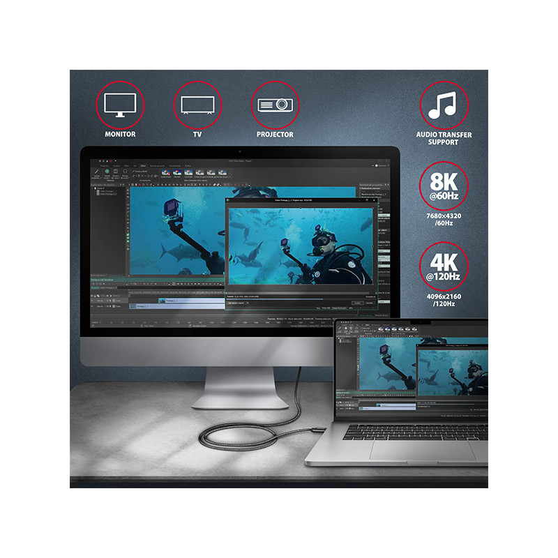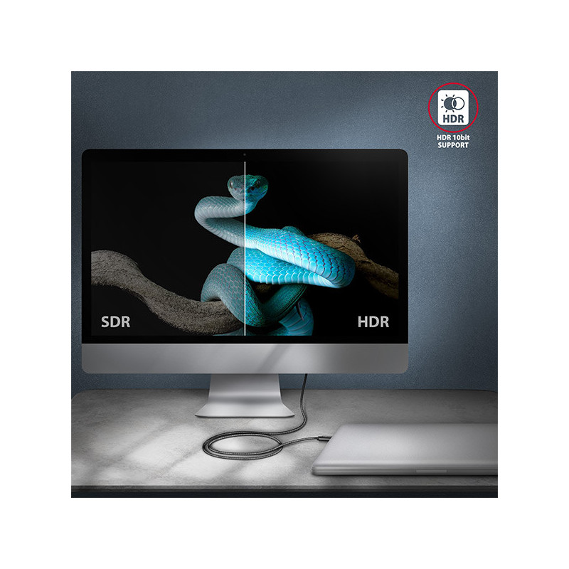 • Podpora protokolu DisplayPort 1.4a, 2.0 pro přenos zvuku a videa až do rozlišení Full Ultra HD 8K@60Hz, HDR10 - je nutný USB-C port s podporou DisplayPort Alternate Mode (DP Alt Mode) nebo Thunderbolt 3/4 port.