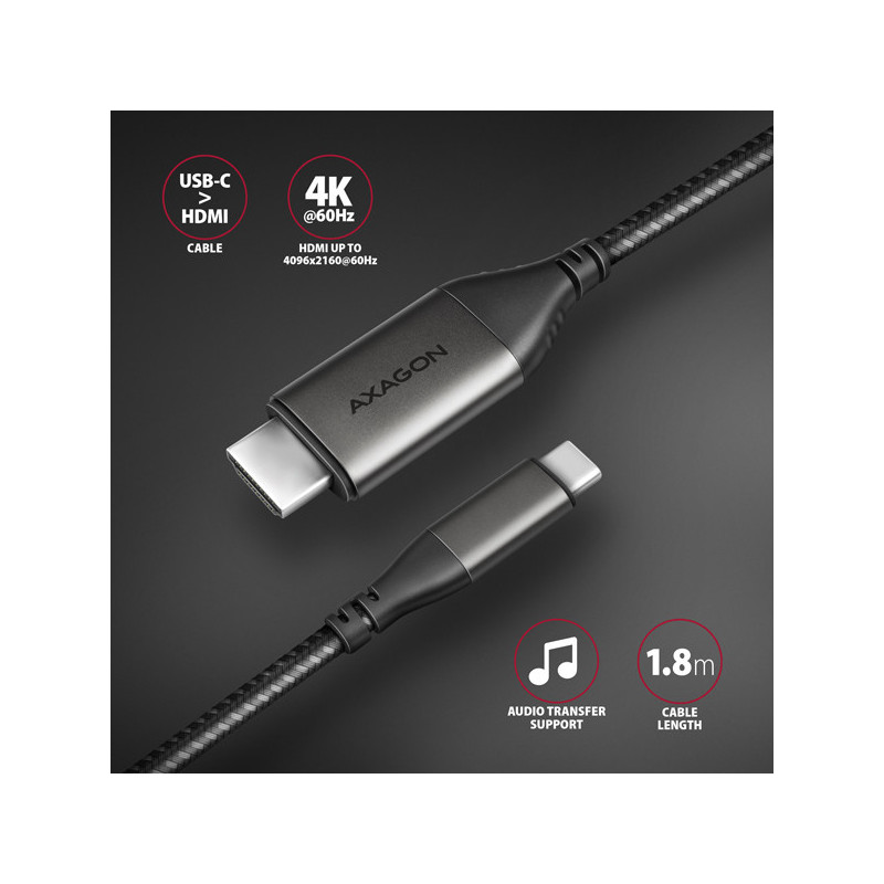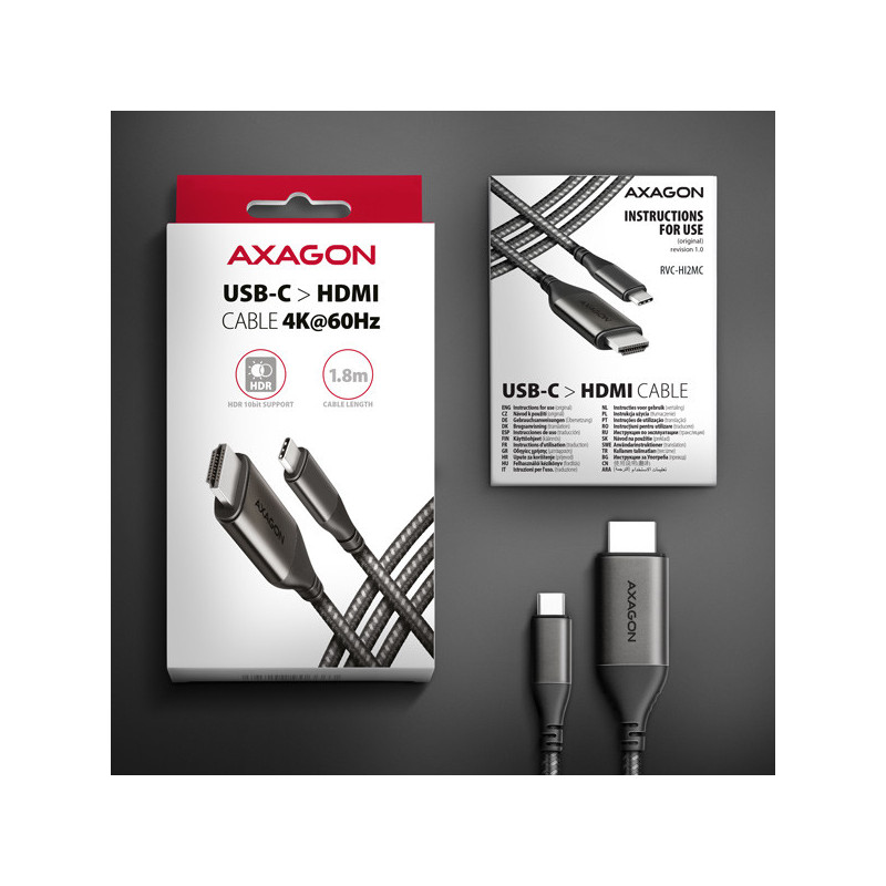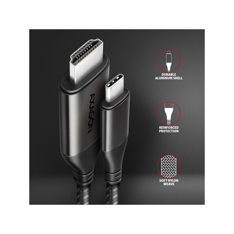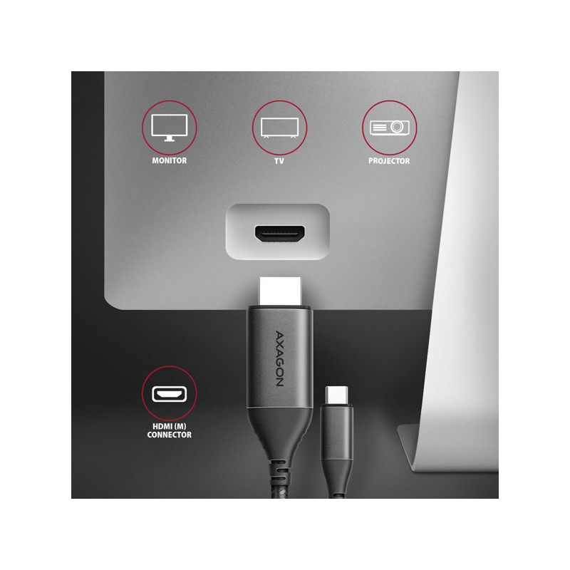 Moderní USB-C -> HDMI aktivní kabelová redukce AXAGON RVC-HI2MC pro připojení HDMI monitoru/TV/projektoru k notebooku nebo telefonu pomocí USB-C konektoru.