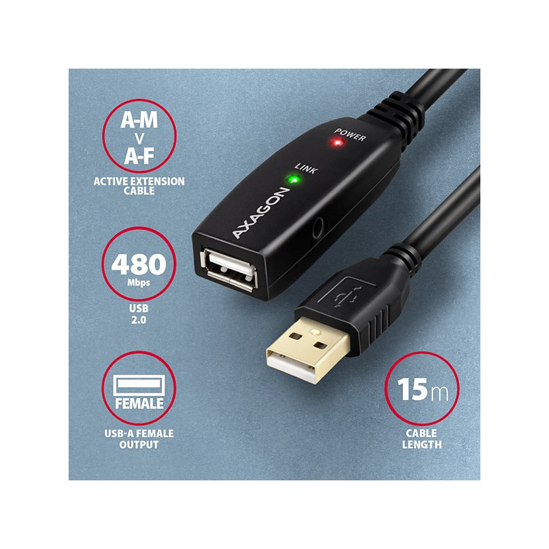 Aktivní prodlužovací USB 2.0 kabel AXAGON ADR-215 délky 15 metrů je ideální k propojení Vašeho počítače s USB zařízením jako je myš, klávesnice, webkamera, tiskárna, skener, plotr a dalšími. Aktivní USB repeater kabel zesiluje průchozí signál a umožnuje připojit USB zařízení na výrazně větší vzdálenost, než Vám umožní pasivní kabel. Dosah kabelu je možné dále prodloužit použitím několika kabelů za sebou.