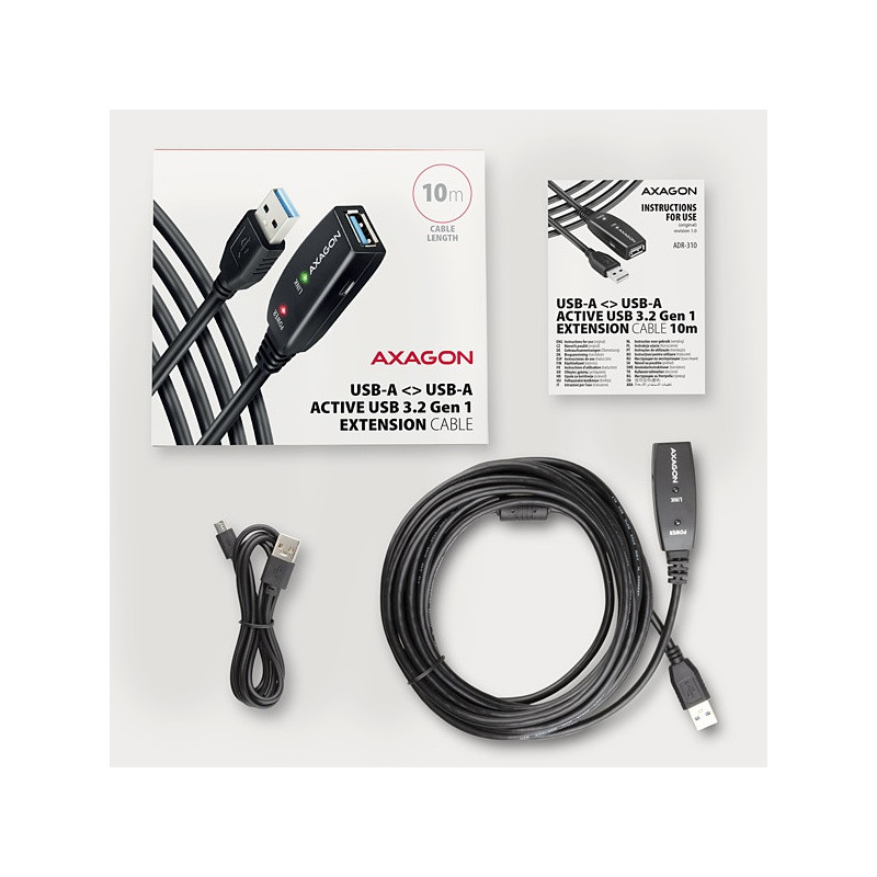 Aktivní prodlužovací USB 3.2 Gen 1 kabel AXAGON ADR-310 délky 10 metrů je ideální k propojení Vašeho počítače s USB zařízením jako je myš, klávesnice, webkamera, tiskárna, skener, plotr a dalšími. Aktivní USB repeater kabel zesiluje průchozí signál a umožnuje připojit USB zařízení na výrazně větší vzdálenost, než Vám umožní pasivní kabel. Dosah kabelu je možné dále prodloužit použitím několika kabelů za sebou.