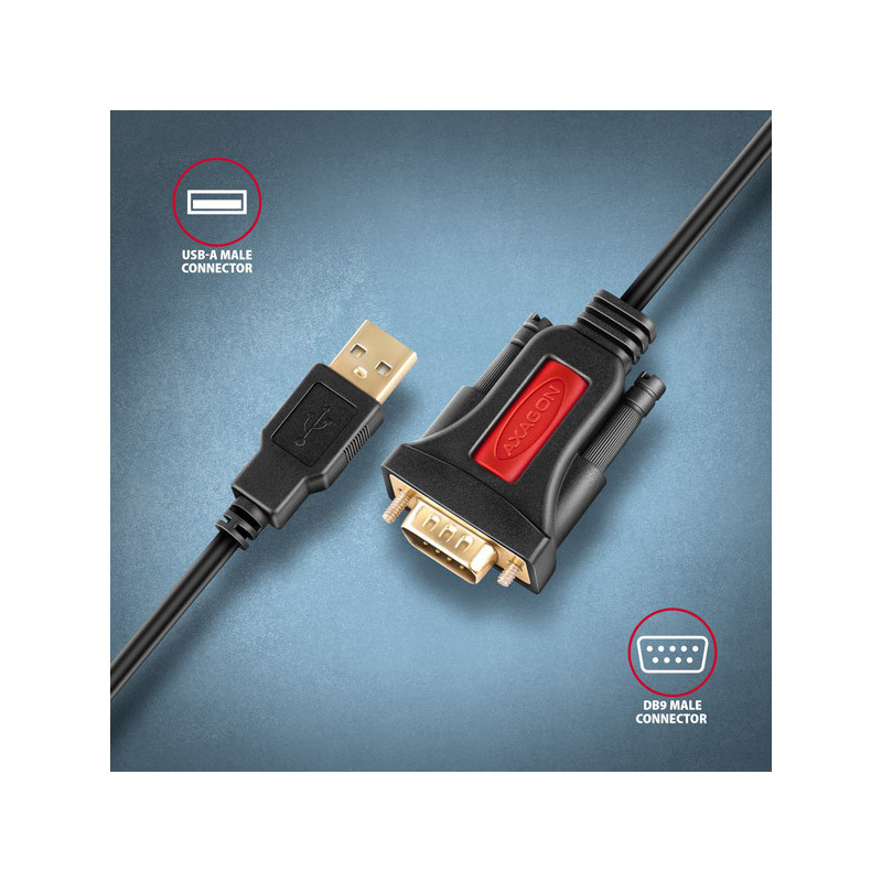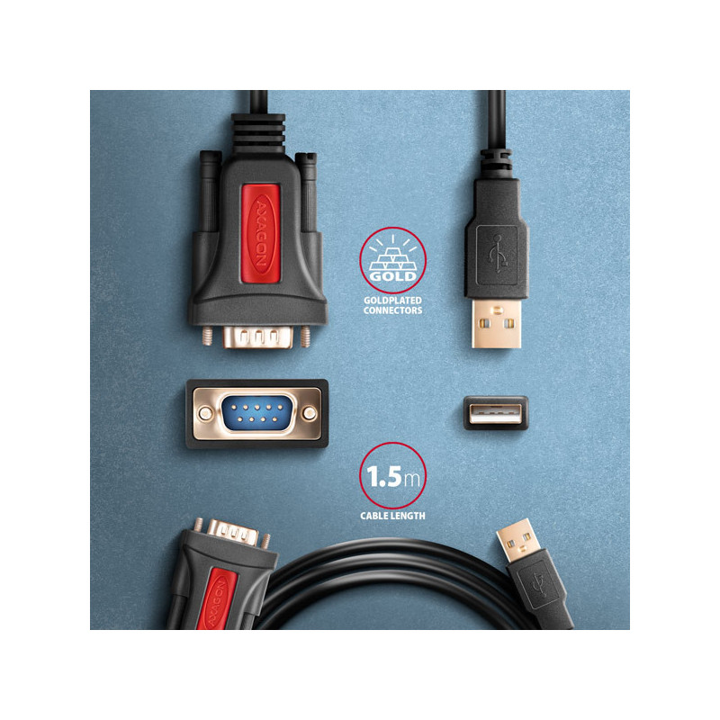 Napevno uchycený 1.5 m dlouhý USB-A kabel je vhodný pro použití jak se stolním počítačem, tak i notebookem. Kabel je opatřen pozlacenými konektory a kontakty, velmi odolné tělo adaptéru je vhodné i do průmyslových aplikací. Dvojité stínění chrání přenášené signály před nepříznivým rušením.
