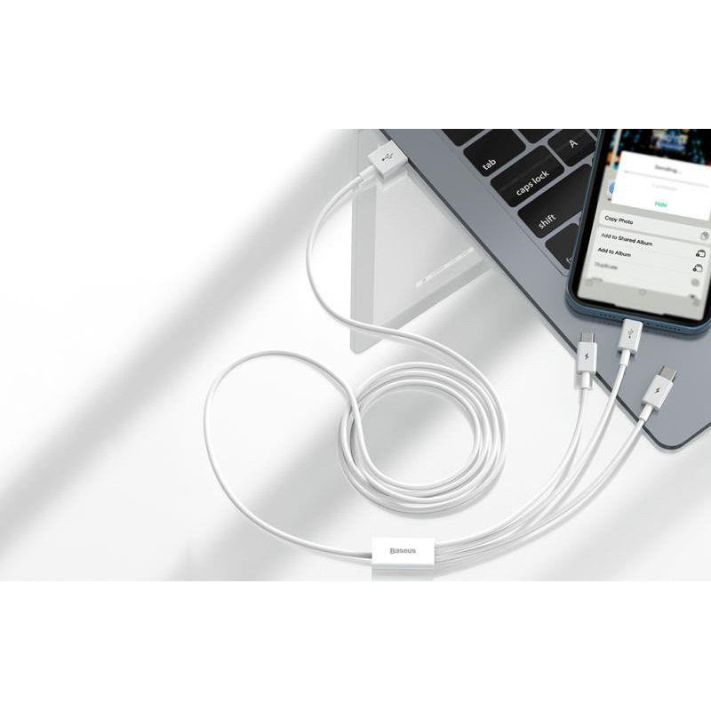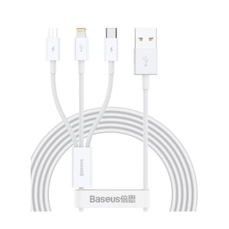 Datový kabel Baseus Superior 3v1 microUSB+Lightning+USB-C 1,5m 3,5A bílýBaseus Superior 3v1 kabel pro nabíjení zařízení s USB-C, Lightning a microUSB z USB konektoru notebooku nebo síťové nabíječky. Kabel je opletený pro maximální pevnost a dlouhou životnost, podporuje a 1.5m délkou. V balení dále najdete suchý zip pro pohodlné a snadné sepnutí kabelu např při přepravě. Je vybaven pevnými koncovkami se zesílenými konci pro dlouhou životnost.