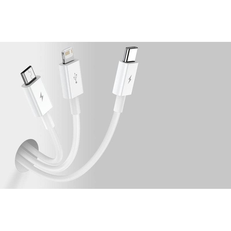 * Materiál: ABS+TPE* Nabíjecí proud: 3.5A (Max.) 2A max pro jeden z konektorů* Přenosová rychlost 480Mbps* Vstup USB* Výstup: MicroUSB+Lightning+USB-C* Datové funkce podporuje pouze Lightning* Délka: 1.5m