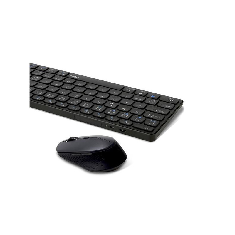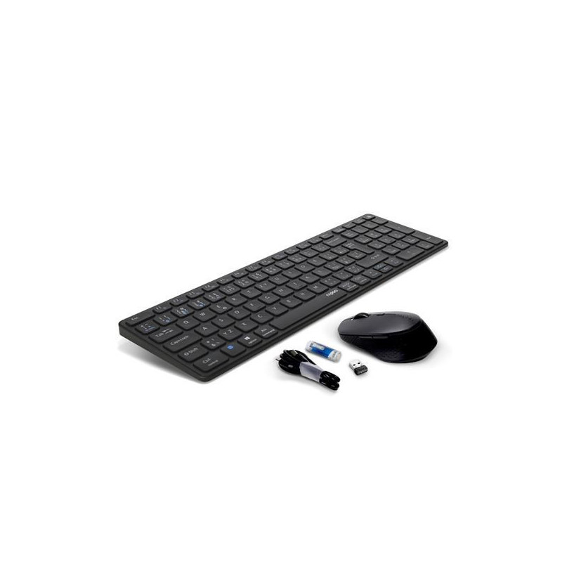 Tato ultratenká stolní souprava využívá prvotřídní materiály v elegantním a kompaktním provedení, které ani přesto nepostrádá blok číselných kláves. Díky pevné hliníkové základně je tělo klávesnice odolné a pevné. Zároveň dodá každému pracovnímu místu stylový punc. Klávesnice E9700M je nejen vyspělá konstrukcí, ale také funkcionalitou. Nabízí vícerežimovou technologii připojení firmy Rapoo – prostřednictvím spolehlivého bezdrátového vysílače 2,4 GHz, Bluetooth 3.0 a 5.0 – umožňuje současné připojení a přepnutí několika zařízení (s automatickým párováním). Myš v této sadě disponuje vysoce výkonným optickým senzorem, plně nastavitelným v rozsahu 600 až 1600 DPI a tichými spínači. Kromě toho je klávesnice vybavena ekologicky šetrným dobíjecím akumulátorem tak, abyste si mohli plně vychutnat volnost bez kabelů.
