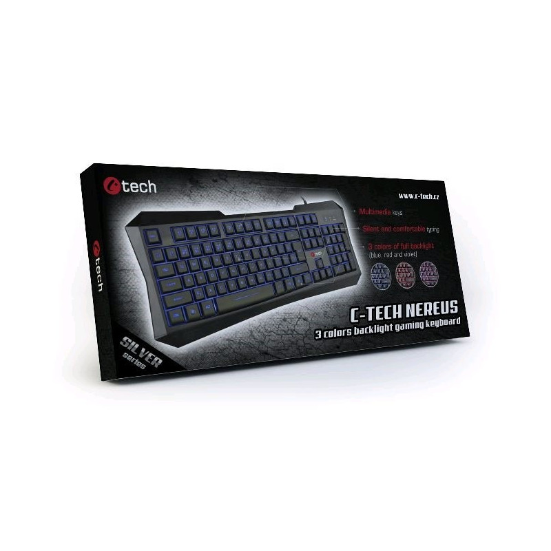 NEREUS je novou herní klávesnicí značky C-TECH, která nabízí plně podsvícené klávesy s možností volby 3 barev podsvícení. Elegantní podsvícení je možno přepínat nebo vypnout pomocí speciální klávesy. Technologie speciálně navržených membrán garantuje klávesnice velmi vysokou životnost a rychlou odezvu při hraní her. Samozřejmostí je česko-slovenský layout.