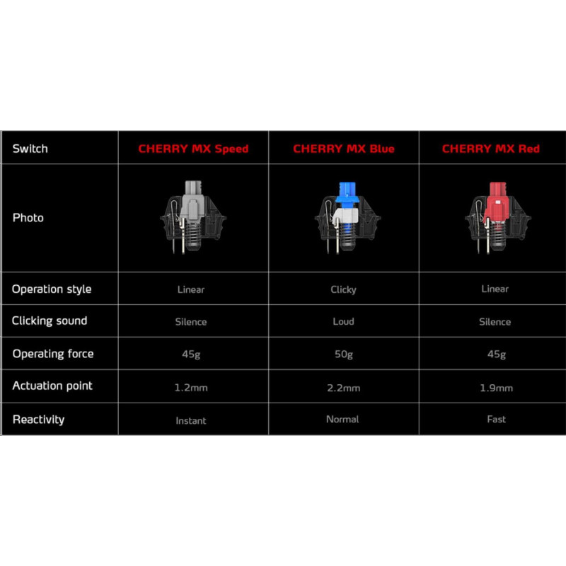 • Klíčový spínač: CHERRY MX Speed Silver/Red/Blue