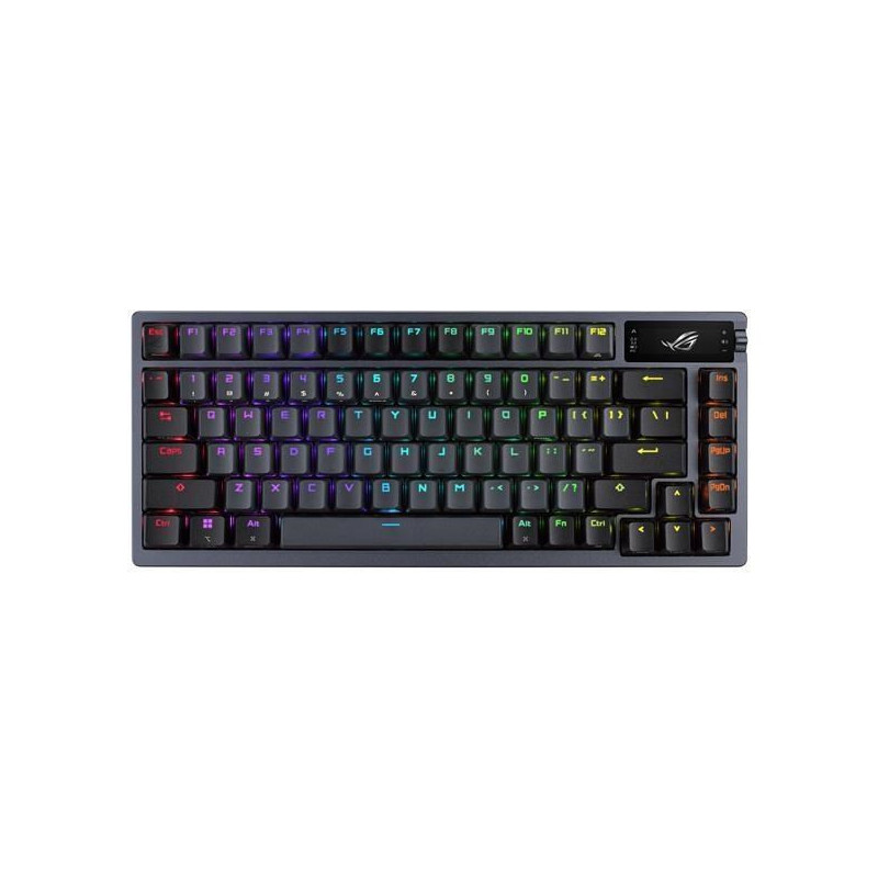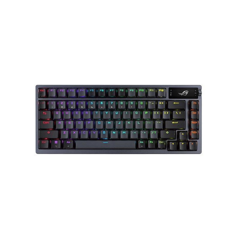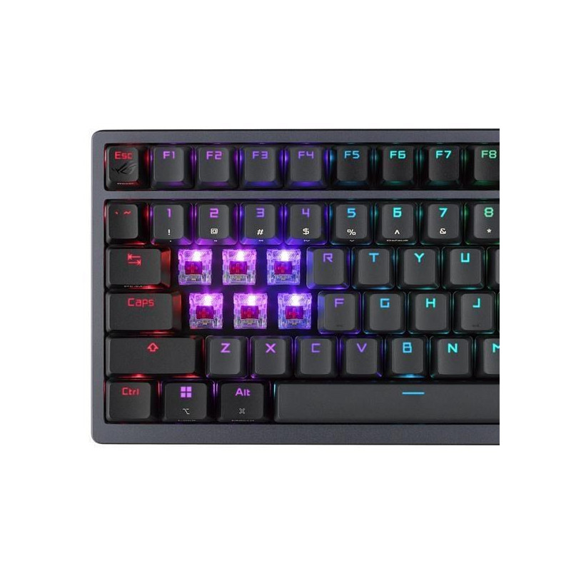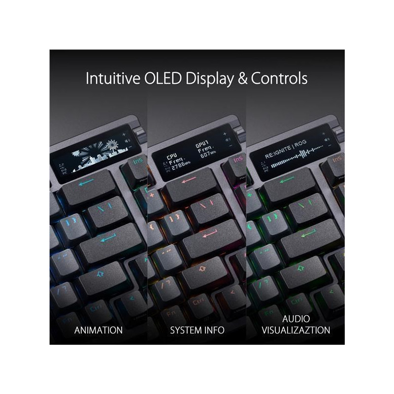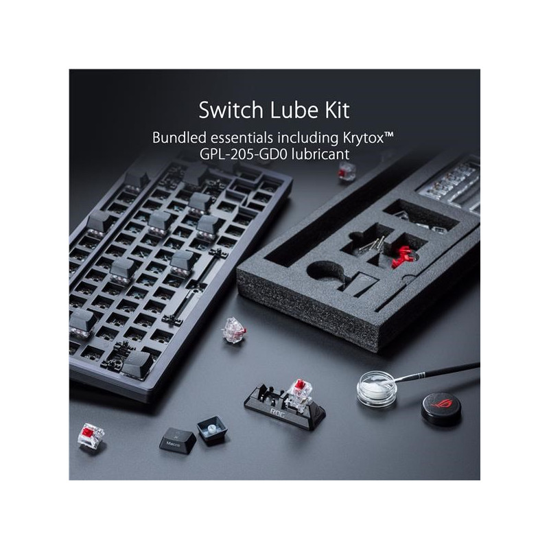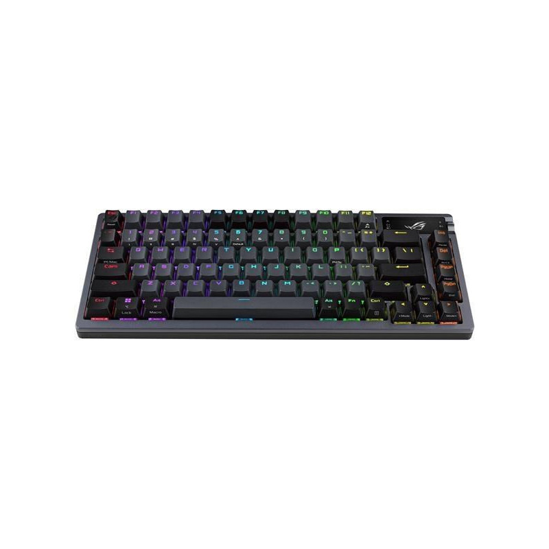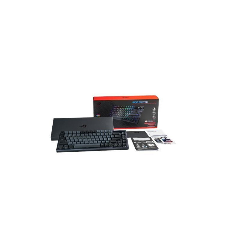 Zakázková herní klávesnice ROG Azoth s tvarovým faktorem klávesnice 75, těsněním, třívrstvou tlumicí pěnou a kovovým horním krytem, vysoce přizpůsobitelná s předem namazanými mechanickými spínači ROG NX vyměnitelnými za provozu, stabilizátory klávesnice ROG, kryty kláves PBT doubleshot a mazací sadou, tri - připojení režimu s 2,4 GHz technologií SpeedNova, OLED displejem, třícestným ovládacím knoflíkem, třemi úhly náklonu a podporou Mac