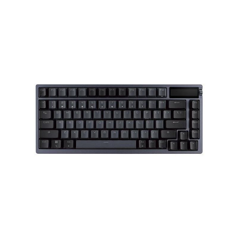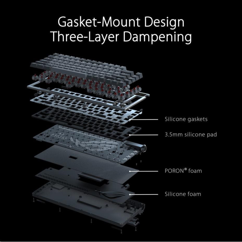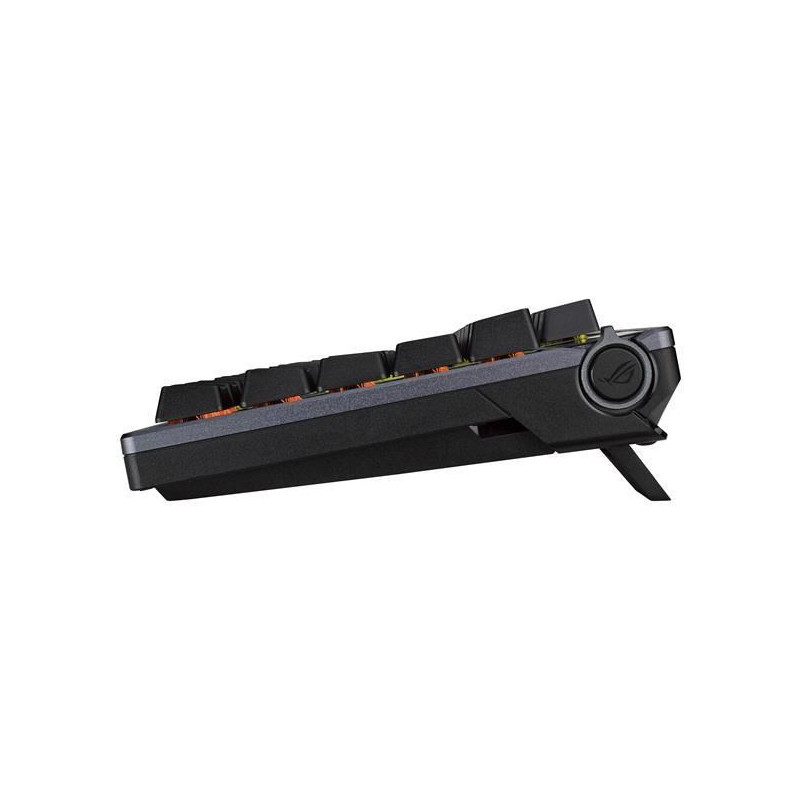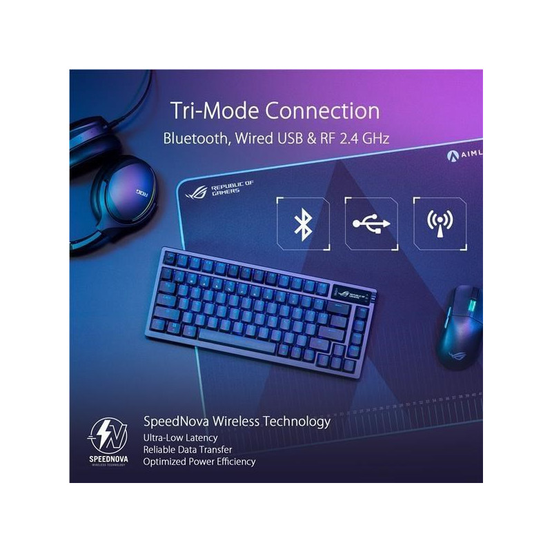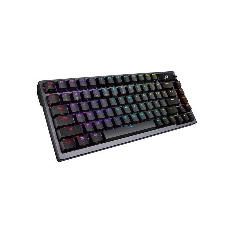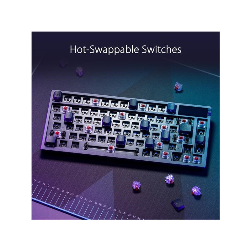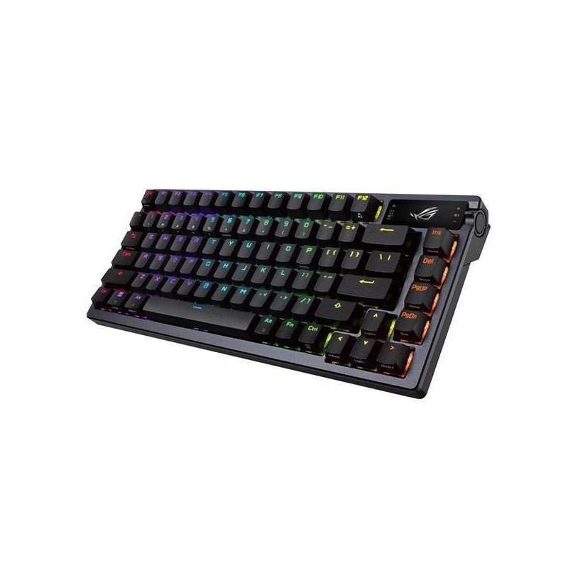 Zakázková herní klávesnice ROG Azoth s tvarovým faktorem klávesnice 75, těsněním, třívrstvou tlumicí pěnou a kovovým horním krytem, vysoce přizpůsobitelná s předem namazanými mechanickými spínači ROG NX vyměnitelnými za provozu, stabilizátory klávesnice ROG, kryty kláves PBT doubleshot a mazací sadou, tri - připojení režimu s 2,4 GHz technologií SpeedNova, OLED displejem, třícestným ovládacím knoflíkem, třemi úhly náklonu a podporou Mac