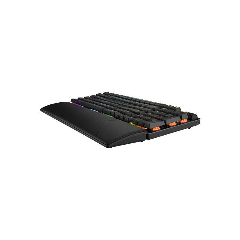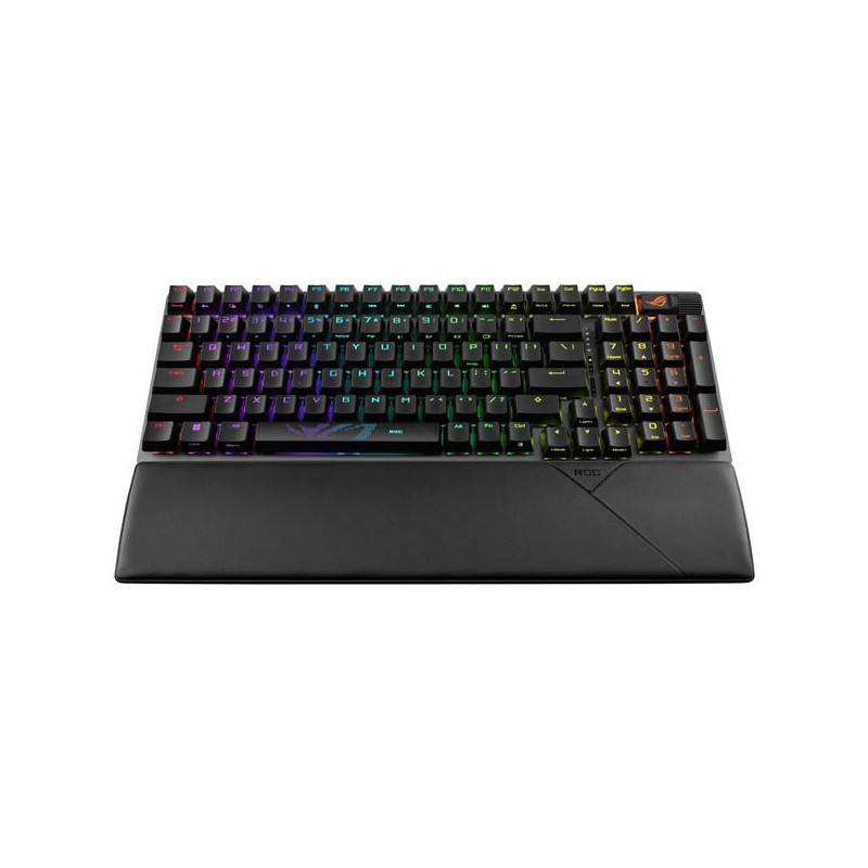 Bezdrátová herní klávesnice ROG Strix Scope II 96 s připojením ve třech režimech, klávesové zkratky pro streamování, multifunkční ovládací prvky, mechanické spínače ROG NX s možností výměny za provozu, stabilizátory klávesnice ROG, krytky kláves PBT doubleshot a silikonová tlumicí pěna, tři úhly sklonu a opěrka zápěstí