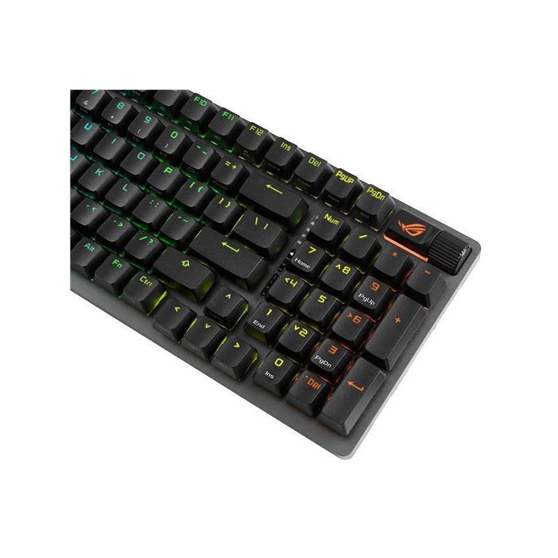 • Připojení ve třech režimech: Připojte se pomocí Bluetooth (až tři zařízení), 2,4 GHz s bezdrátovou technologií ROG SpeedNova (až 1500 hodin výdrže baterie) nebo kabelového USB přepínače vyměnitelné za chodu: Předem namazané lineární přepínače NX Snow se stěnou konstrukce představce, která zvyšuje stabilitu a zabraňuje vnikání prachu