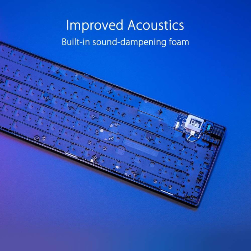 Herní klávesnice ROG Strix Scope II s předem namazanými mechanickými spínači ROG NX Snow a NX Storm, pěnou tlumící zvuk, dvojitými krytkami kláves PBT nebo ABS s UV povlakem, klávesovými zkratkami pro streamování, multifunkčními ovládacími prvky, třemi úhly sklonu a opěrkou zápěstí
