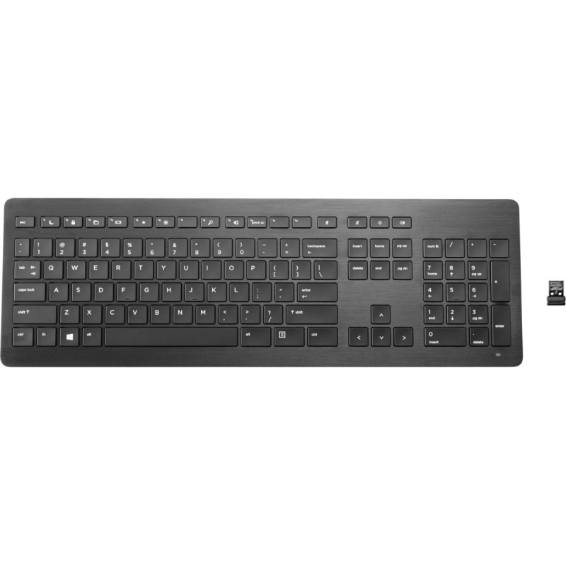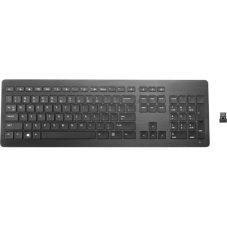 Zvyšte svou produktivitu a pohodlně pracujte u stolu nebo jinde v místnosti na elegantní, přepracované bezdrátové klávesnici HP Premium s rámečkem z eloxovaného hliníku.