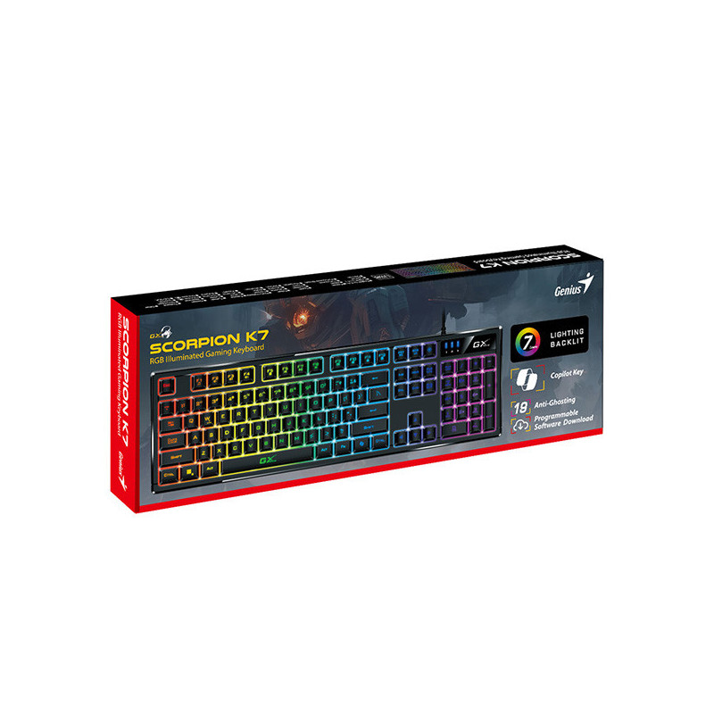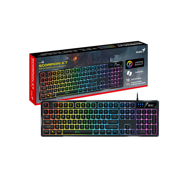 Herní klávesnice Scorpion K7 nabízí programovatelná makro tlačítka a LED podsvícení v sedmi barvách. Samozřejmostí je funkce Anti-ghosting pro 19 kláves, která umožňuje jejich současné stisknutí bez omezení funkčnosti. Zajisté potěší také samostatná klávesa pro vyvolání AI asistenta Windows Copilot (pro Windows 11 a vyšší). Připojení lze jednoduše realizovat skrze 1,8 m dlouhý USB kabel.
