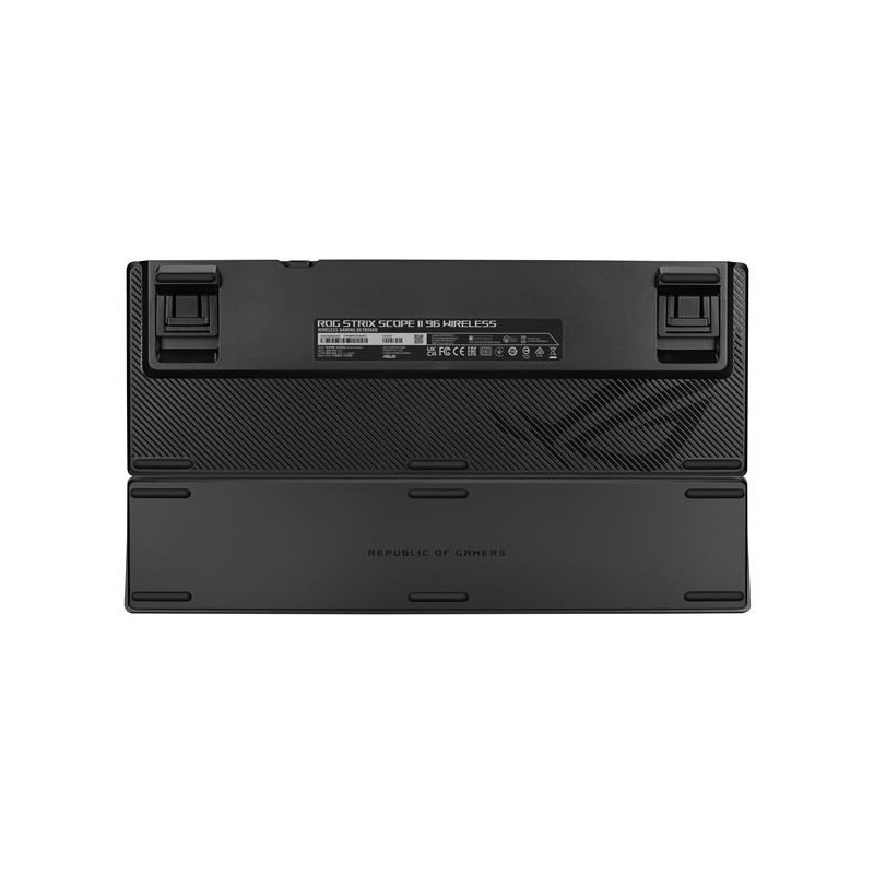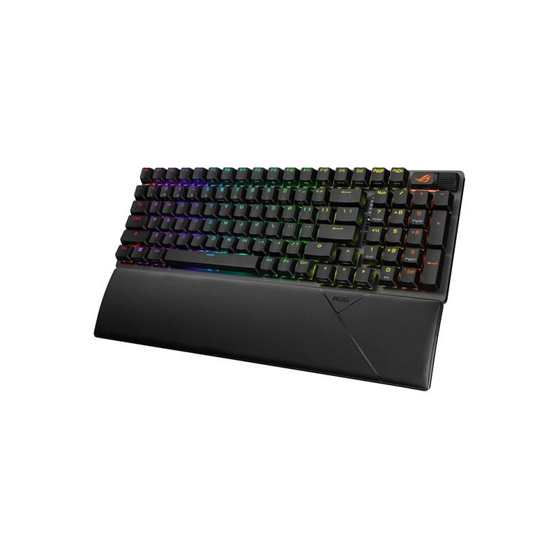 Bezdrátová herní klávesnice ROG Strix Scope II 96 s připojením ve třech režimech, klávesové zkratky pro streamování, multifunkční ovládací prvky, mechanické spínače ROG NX s možností výměny za provozu, stabilizátory klávesnice ROG, krytky kláves PBT doubleshot a silikonová tlumicí pěna, tři úhly sklonu a opěrka zápěstí