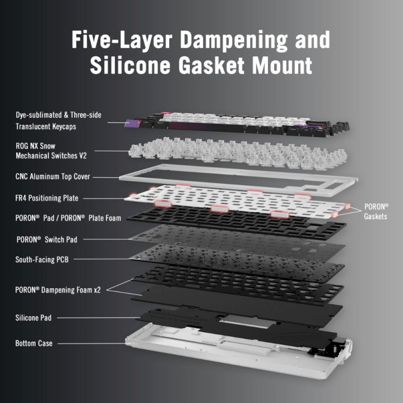 Vlastní herní klávesnice ROG Azoth X 75% s mechanickými spínači ROG NX V2 vyměnitelnými za provozu, barvenými a poloprůhlednými klávesami, kovovým horním krytem, těsněním, pětivrstvou tlumicí pěnou, polohovací deskou FR4, deskou plošných spojů orientovanou na jih, třírežimovým připojením s technologií SpeedNova 2,4 GHz, displejem OLED, třísměrným ovládacím kolečkem, opěrkou zápěstí, třemi úhly náklonu a podporou počítačů Mac.