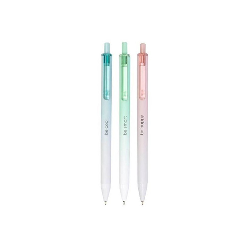 Odlehčené pero se stiskacím mechanismem. Mix pastelových barev. Sametově hladký povrch s potiskem be happy, be cool, be smart. Náplň modrá easy ink. Šířka stopy 0,5 mm.