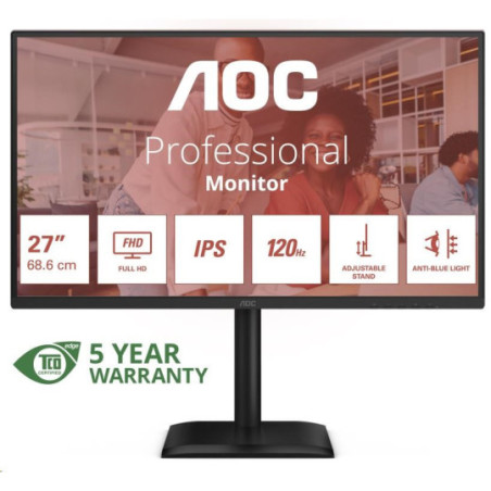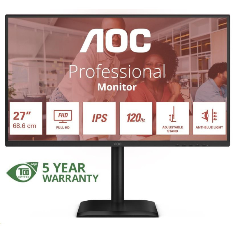 Model 27E4U nabízí 27" FHD displej s obnovovací frekvencí 120 Hz, který zajišťuje ostrý a plynulý obraz pro lepší zážitek ze sledování. Výškově nastavitelný stojan (HAS) poskytuje ergonomickou flexibilitu a hardwarová technologie potlačení modrého světla pomáhá snižovat únavu očí při delším používání. Díky technologii Adaptive Sync pro plynulý výkon a pětileté záruce na dlouhodobou spolehlivost je tento monitor praktickým a spolehlivým doplňkem každého pracovního prostoru.