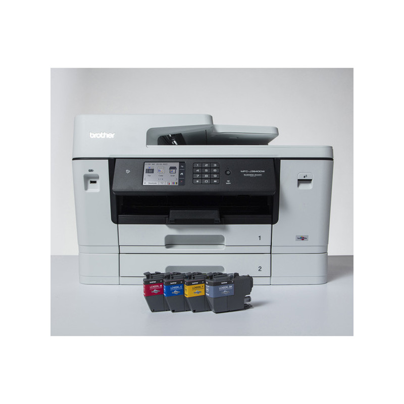Profesionální multifunkční inkoustová bezdrátová tiskárna Profesionální multifunkční tiskárna A3 / A4 MFC-J3940DW je vyrobena pro dlouhou životnost a splnění potřeb náročných malých kanceláří a obchodních pracovních skupin. Volba A3 vám umožňuje bez jakýchkoliv potíží produkovat libovolné vysoce kvalitní barevné dokumenty A3 i A4 s vysokou rychlostí tisku a nízkými provozními náklady. K dispozici jsou funkce tisku, kopírování, skenování a faxování. Tisknout můžete z pracovní stanice, v zasedací místnosti nebo z mobilního zařízení s bezdrátovým připojením. Komunikace v blízkém poli (NFC) umožňuje okamžitě tisknout přímo z vašeho mobilního zařízení. *Inkjet *8,8 cm barevný dotykový LCD