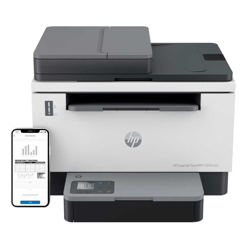 Obsah balení: 381V1A Tiskárna HP LaserJet Tank MFP 2604sdw; Černý originální zobrazovací válec HP LaserJet Tank (v balení zaváděcí s výtěžností černého toneru cca 5 000 stran); Napájecí kabel; Instalační příručka; Referenční příručka; Letáky s regulačními informacemi / informační letáky