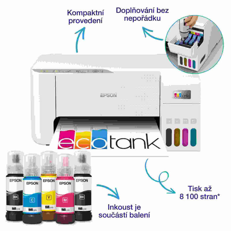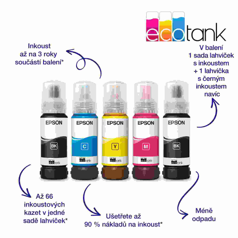 Ušetřete až 90 % nákladů na tisk s tiskárnami EcoTank od společnosti Epson bez inkoustových kazet. Integrované inkoustové nádržky se snadno doplňují díky speciálně navrženým velkoobjemovým lahvičkám s inkoustem. Bez nutnosti výměny inkoustových kazet a s flexibilními funkcemi připojení je to dokonalá tiskárna pro každého, kdo hledá vysoce kvalitní výtisky za neuvěřitelně nízké náklady na tisk jedné strany.