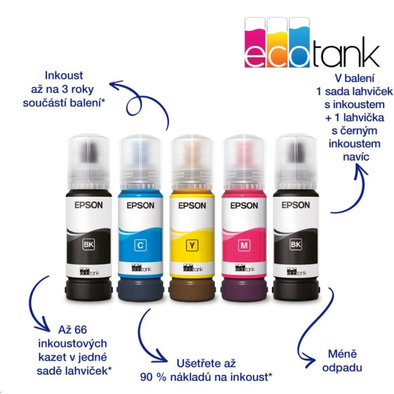 Ušetřete až 90 % nákladů na tisk s tiskárnami EcoTank od společnosti Epson bez inkoustových kazet. Integrované inkoustové nádržky se snadno doplňují díky speciálně navrženým velkoobjemovým lahvičkám s inkoustem. Bez nutnosti výměny inkoustových kazet a s flexibilními funkcemi připojení je to dokonalá tiskárna pro každého, kdo hledá vysoce kvalitní výtisky za neuvěřitelně nízké náklady na tisk jedné strany.