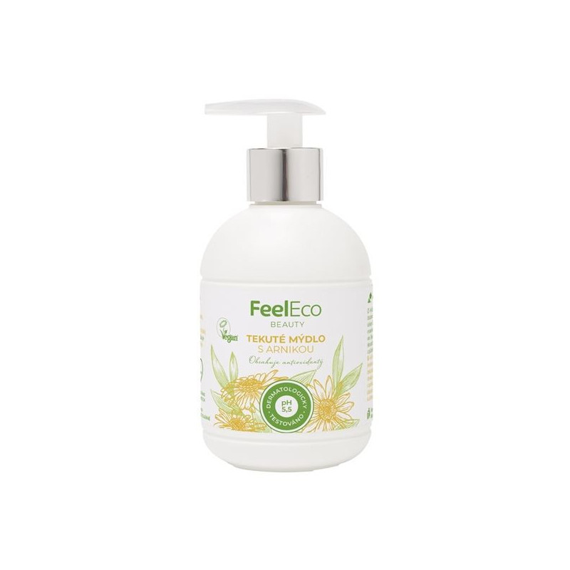*Ekologické tekuté mýdlo Feel Eco s arnikou je vhodné pro každodenní mytí rukou *Díky svému složení je šetrné k pokožce a ocení ho i alergici *Malá dávka šetří vaše peníze i přírodu *Jemně navrací přirozenou ochranu kůže*pH mýdla 5,5 je neutrální k pokožce, promaštující receptura o ni navíc aktivně pečuje *Má velmi kvalitní složení, většinová složka je cukerného původu, obsahuje glycerin, arniku a řadu zjemňujících látek *Arnika podporuje mikrocirkulaci a navrací tak pokožce svěžest, příznivě působí na hojení pokožky *Dermatologicky testováno, vhodné pro citlivou pokožku *Vegan - produkt není testován na zvířatech a složení neobsahuje žádné látky živočišného původu *Neobsahuje alergeny *100% recyklovatelný obal *Neobsahuje silikony a parabeny*Láhev s pumpičkou i etiketa jsou plně recyklovatelné *Objem 300 ml