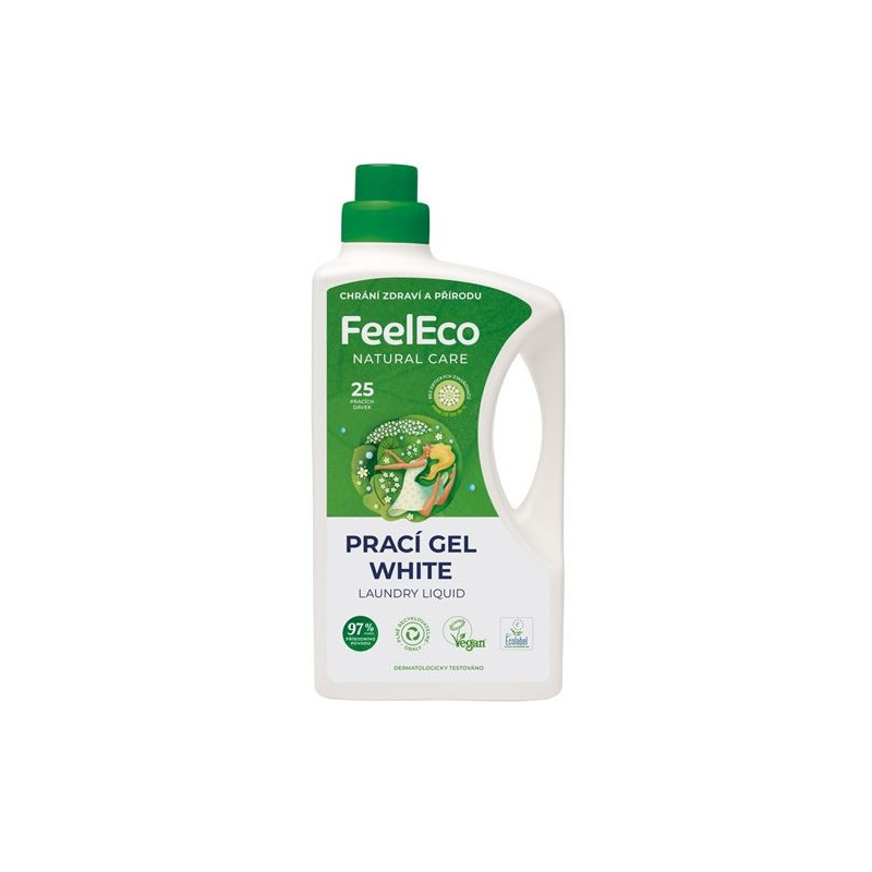 *Feel Eco je koncentrovaný tekutý prací prostředek určený na praní bílého prádla již při nízkých teplotách*Všechny použité povrchově aktivní látky jsou anaerobně i aerobně biologicky rozložitelné*Pere výborně již při teplotě 30 °C *Dermatologicky testováno, má neutrální pH, nevysušuje a nedráždí kůži *Bez oprických zjasňovačů *Vhodný i na praní funkčního a sportovního prádla *Obsahuje složky, které chrání a oživují barvu praných textilií *100% recyklovatelný obal *25 pracích dávek*Objem: 1,5 l*Množství v originálním balení 9 ks