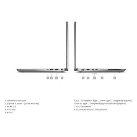 1. Universal audio port 6. (2) Thunderbolt 4 Type C, 100W Type C (Integrated graphics), 130W E5 Type C (Integrated graphics/discrete graphics). |