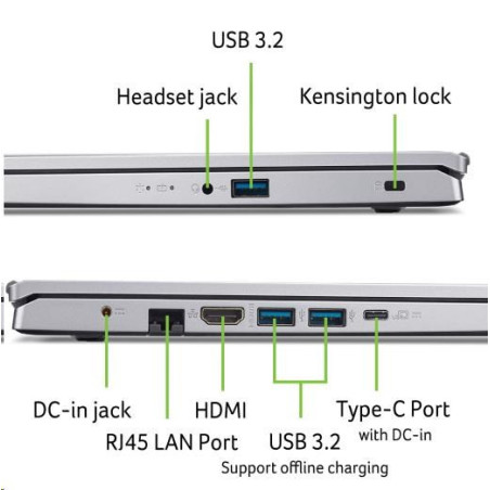 * 1x USB 3.2 Gen 2 typu C (přenos dat až 10Gb/s/podpora DisplayPort přes USB-C/USB napájení 5V; 3A/DC-in port 19V; 65W)