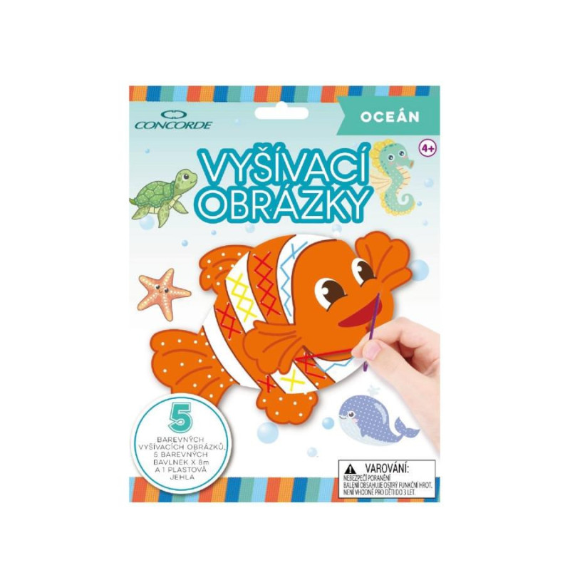 Sada pro dětské vyšívání zahrnuje 5 mořských motivů zvířátek, 5 barevných bavlnek (červenou, zelenou, žlutou, oranžovou a světle modrou) a jednu plastovou jehlu