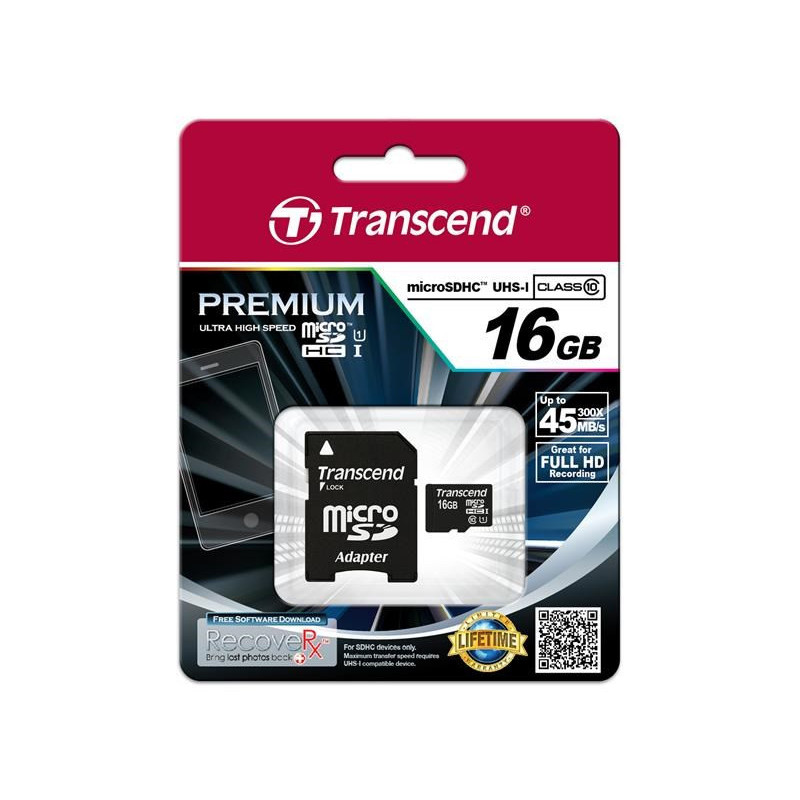 TRANSCEND MicroSDHC karta 16GB Premium, Class 10 UHS-I 300x + adaptér