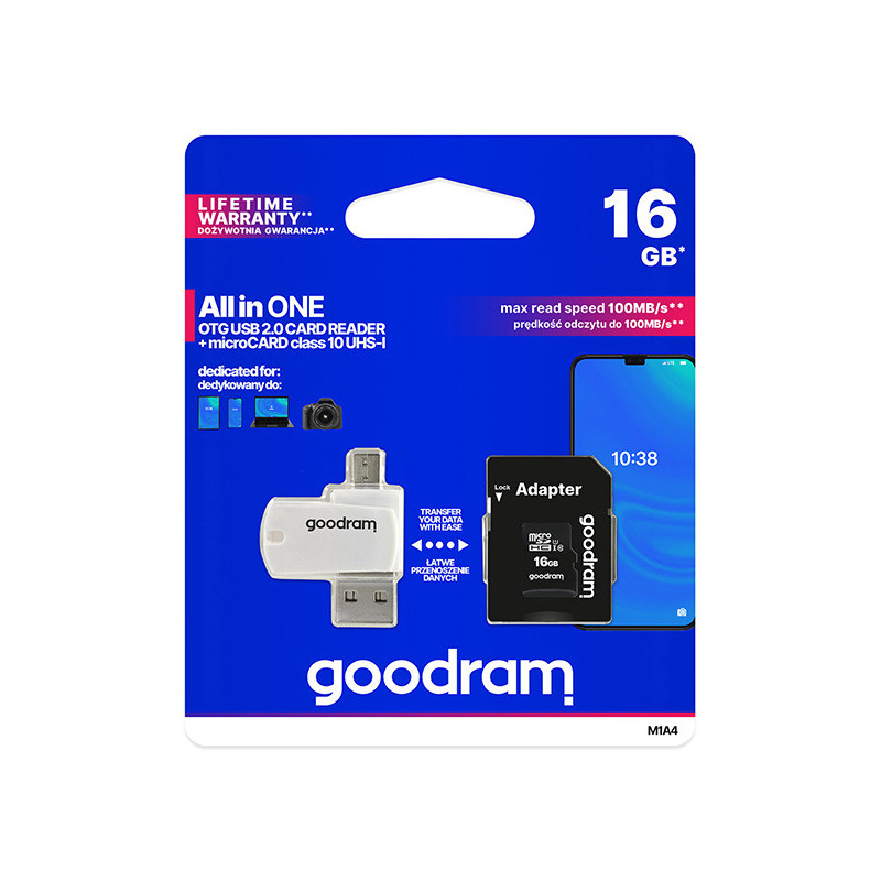 GOODRAM M1A4 All in One delivers versatility by providing functionality of few devices in one solution. It is a card reader equipped with USB 2.0 and micro USB connectors, allowing easy data transfer between computers, smartphones, tablets and cameras. It comes bundled with a fast UHS-I microCard.