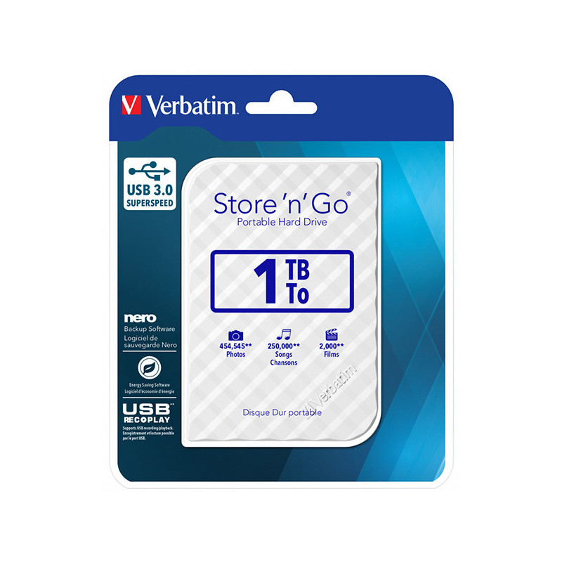Přenosný pevný disk Verbatim Store n Go nabízí velkokapacitní úložiště s rozhraním USB 3.0 Super Speed. Rozhraní USB 3.0 nabízí až desetkrát rychlejší přenos dat než USB 2.0 (podle rychlosti sběrnice USB), takže umožňuje extrémně rychlý přenos dat na cestách.
