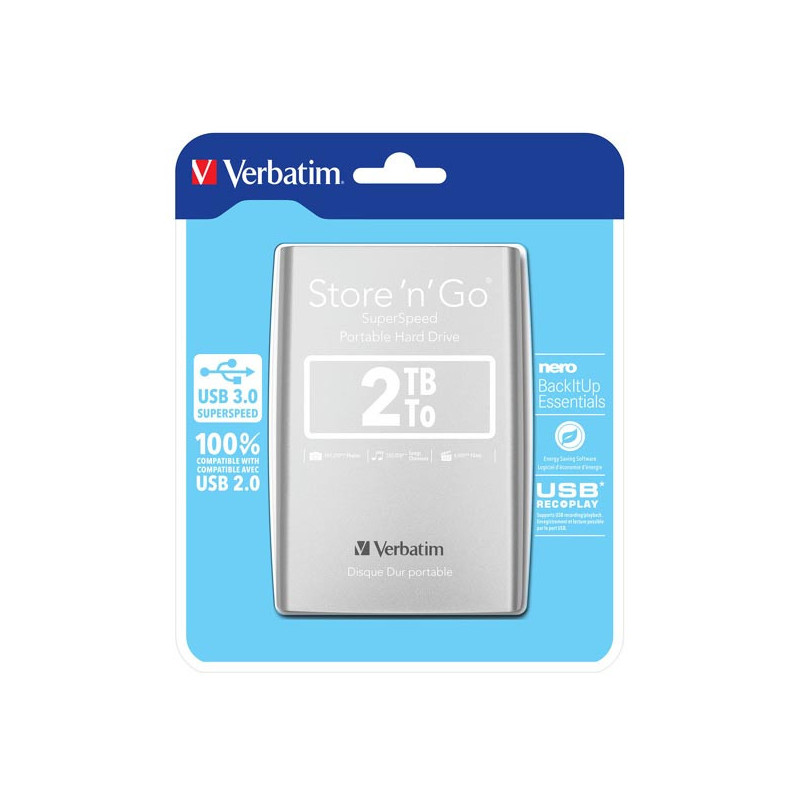 Přenosný pevný disk Verbatim Store n Go nabízí velkokapacitní úložiště s rozhraním USB 3.0 Super Speed. Rozhraní USB 3.0 nabízí až desetkrát rychlejší přenos dat než USB 2.0 (podle rychlosti sběrnice USB), takže umožňuje extrémně rychlý přenos dat na cestách.