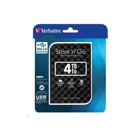 Přenosný pevný disk Verbatim Store n Go nabízí velkokapacitní úložiště s rozhraním USB 3.0 Super Speed. Rozhraní USB 3.0 nabízí až desetkrát rychlejší přenos dat než USB 2.0 (podle rychlosti sběrnice USB), takže umožňuje extrémně rychlý přenos dat na cestách.