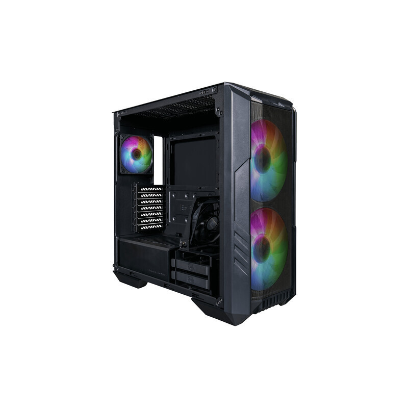Klasická řada HAF společnosti Cooler Master se vrací s modelem HAF 500. Model HAF 500 je zkonstruován pro vysoký průtok vzduchu a špičkový výkon a může se pochlubit ikonickými 200mm velkými nasávacími ventilátory ARGB, které zajišťují bezkonkurenční účinnost nasávání a chlazení. Šasi je vybaveno speciálním ventilátorem pro GPU, nastavitelným na různé délky GPU. Dostatek prostoru pro dva 360mm radiátory na horním a předním panelu umožňuje použití nejpokročilejších sestav vodního chlazení.